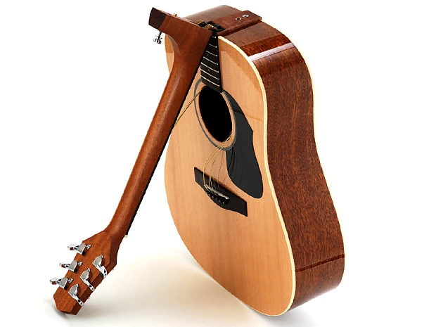 The first example is a foldable guitar with a specific hinge between the neck and the body that allows the user to fold it and put it in a smaller back. It is designed for travellers, to carry it on with you in the plane and anywhere. This design was made by Voyage Air Guitar.