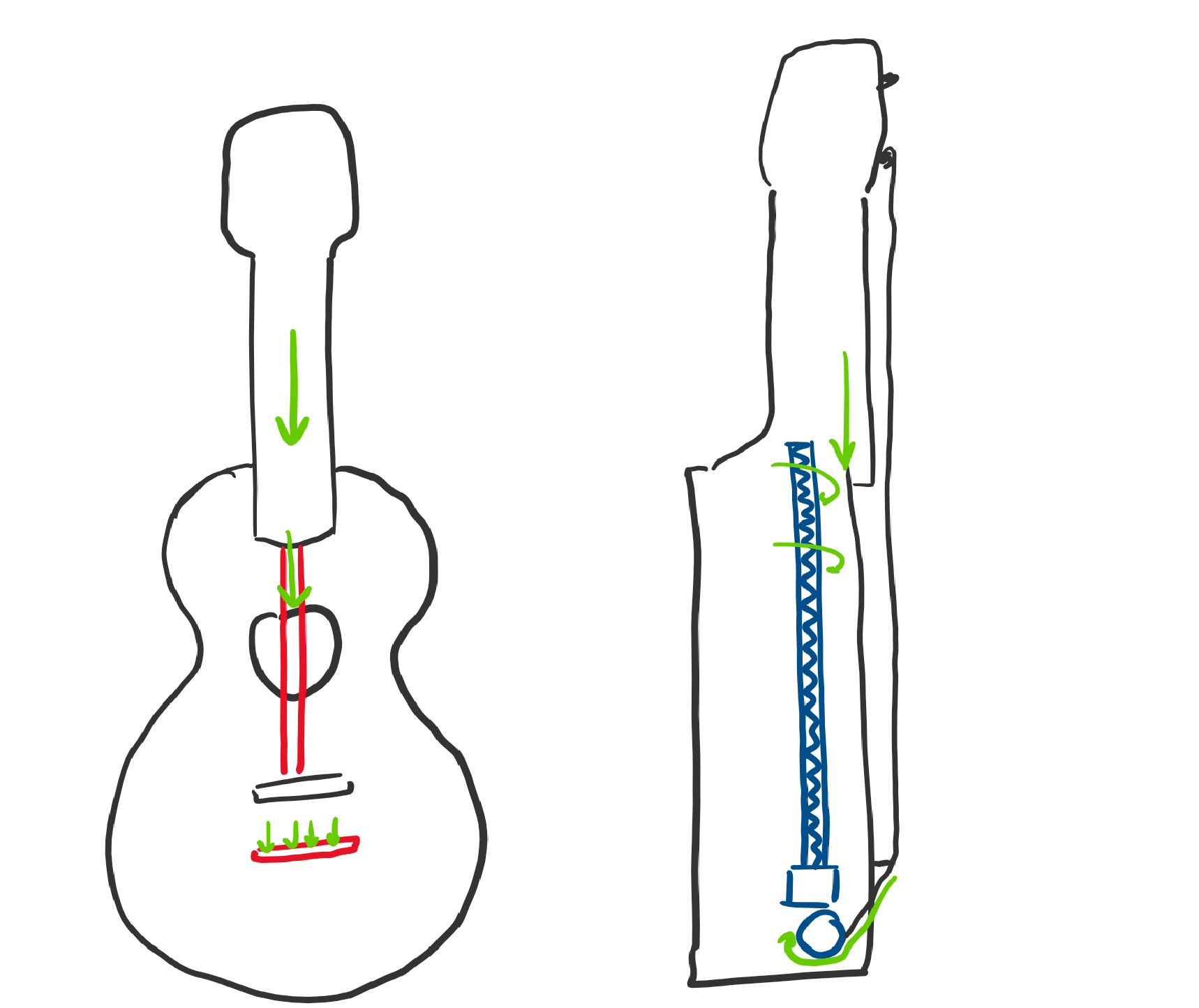 I love to travel with my ukulele, so making a folding one would be a fantastic idea. The first thing I imagined when I came up with the idea was to make it retractable. The idea is that the neck can enter into the body and, to maintain the tension of the strings, that the strings themselves are rolled into a roller inside the same body.