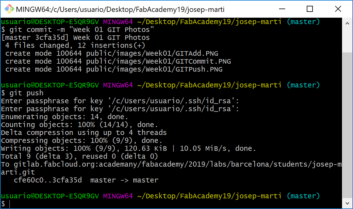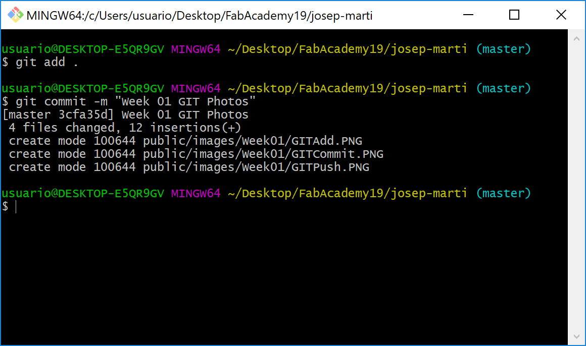 I realized that there were 3 commands that were the ones that I will use every week, the git add, the git commit and the git push. Those are the commands needed to upload all your work, so the one that I will use every day to upload all my progress. Here are some screenshots of the result it has to show: