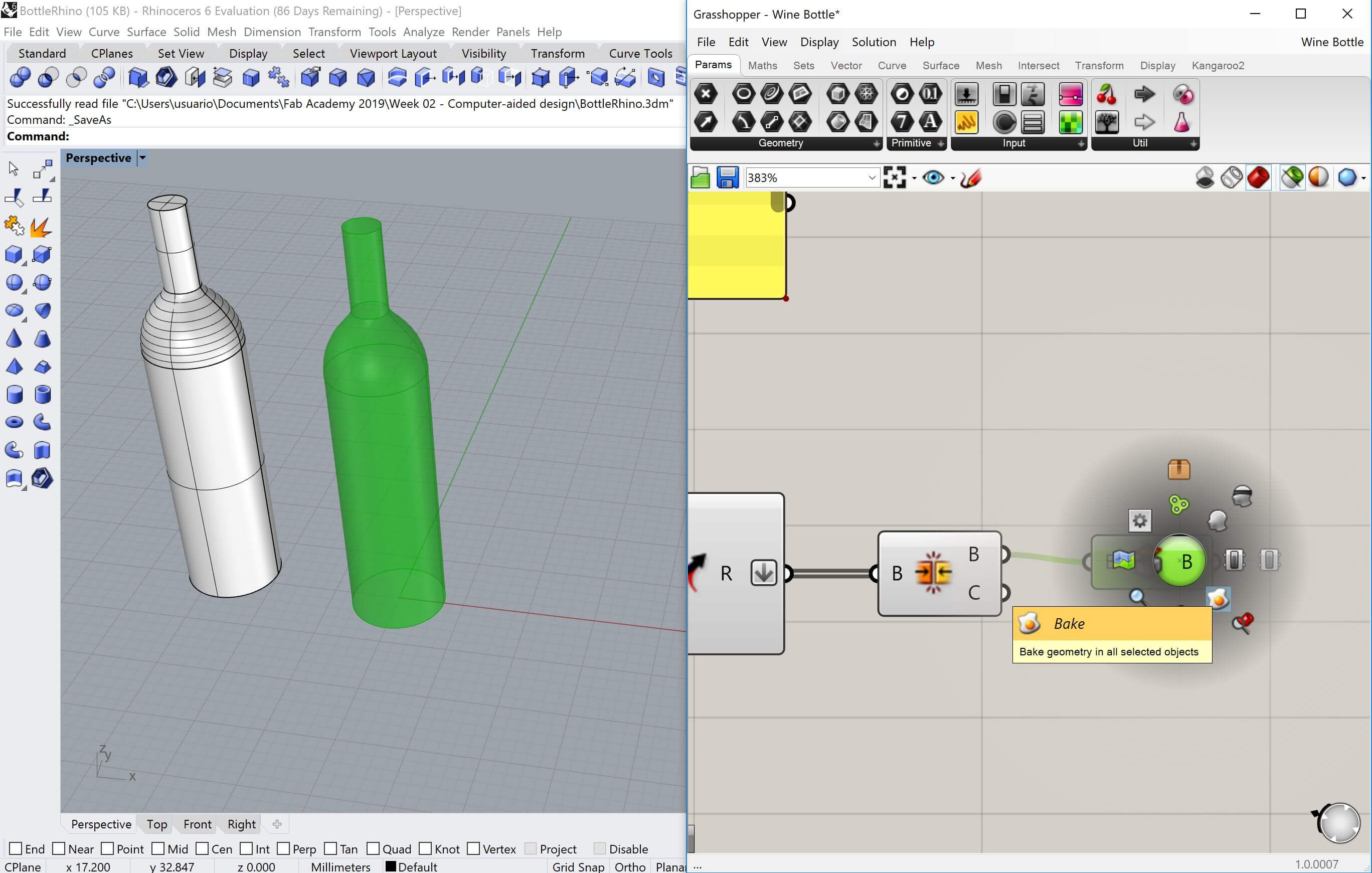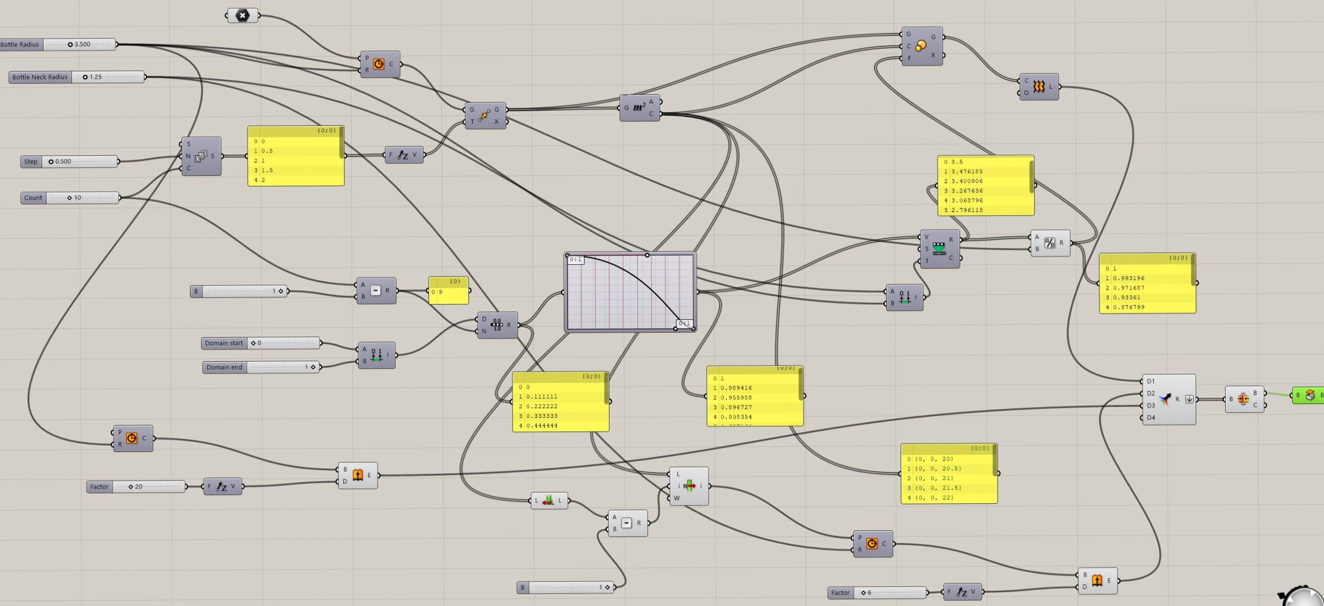 With the design of the supports I decided to model a bottle with Grashopper to lear new softwares and work in a different way. Grasshopper is an extension of Rhino and I did download the trial version, so I have 90 days to design with it. download it from here. Eduardo Chamorro, an instructor from FabLab BCN, gave us a class about Grashopper showing us the workflow and how to create objects, the basic operations and where to find everything. It may seem a complicate program with all the "spaghetti" workflows, but if you get used to it I am sure it is an amazing tool. I didn't have much time, but I manage to get a first design of the bottle after some time investigating and some headaches. You can see here the final flow: