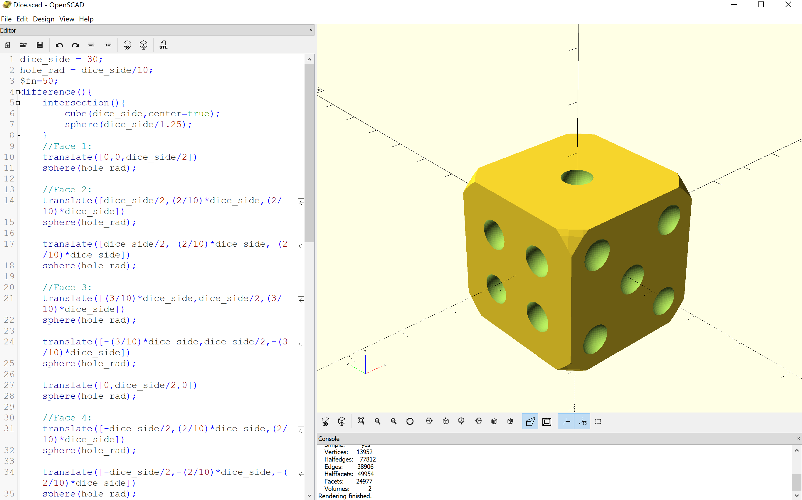 Using OpenSCAD I faced a huge problem, the graphic card on my computer is not powerful enough to show a right preview of the design, so I have to render the result to see how it looks. This doesn't seem a problem, but when the design starts getting bigger with new bodies the render time increases a lot, so it is not easy to work with. My design with a good resolution (using the command $fn=50, they recommend not to use more than 100) it gets around 2 minutes to render the dice. For this reason I discard OpenSCAD for the moment, but I will try more things with it in the future.