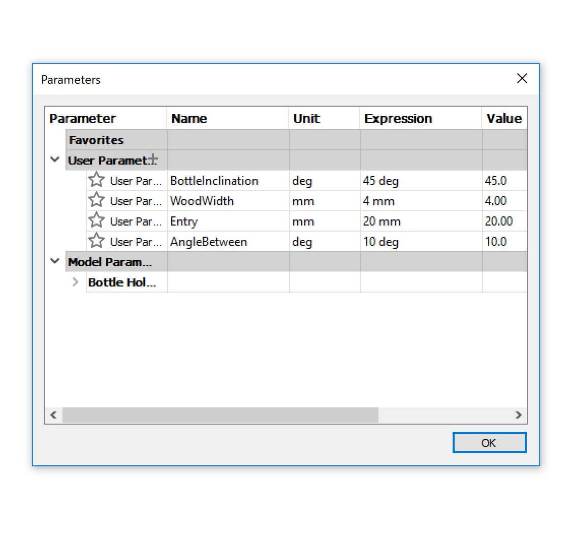 I was used to use SolidWorks, so I change to Fusion 360 to lear about new softwares. They are pretty similar, but maybe fusion is a little bit easier and more clear, so I totally recommend it to anyone, not only for the CAD designer but also for all the other amazing features it has. The first thing to create in Fusion 360 is a sketch. I sketched the geometry of my holder in the right pane and then extrude it and duplicate it. The requirements were that the bottle must be 45º and it needs some support at the end to hold correctly the bottle. Because I didn't have the exact specifications of the bottles I decided to do a parametric design, where I define some variables that can now be easily changed to get a new design. Those variables where the Wood Widht, the Bottle Inclination Angle, the Lenght of the bottle in contact with the support and the dimension of the join between the holders and the pice that fix them together called Entry.