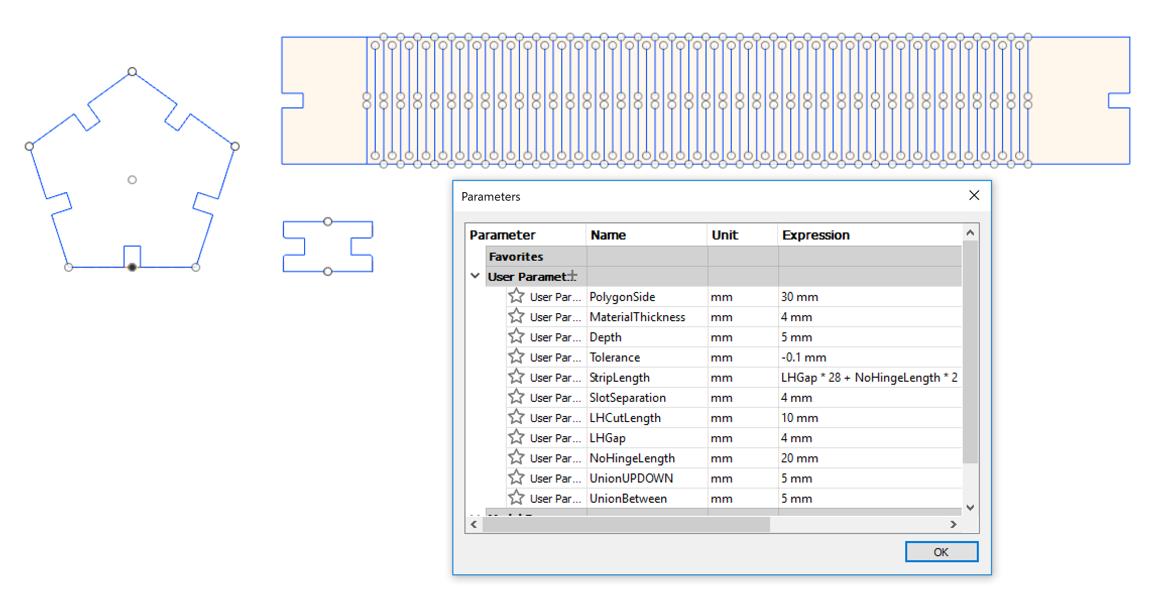 In the lab we have 3 machines, but I keep using the Trotec 400 where we did the tests. I fell in love with living hinges, so I decided to do a press kit with them. My idea was to create a bouncing ball, so I designed some living hinge strips and a piece to join them together.