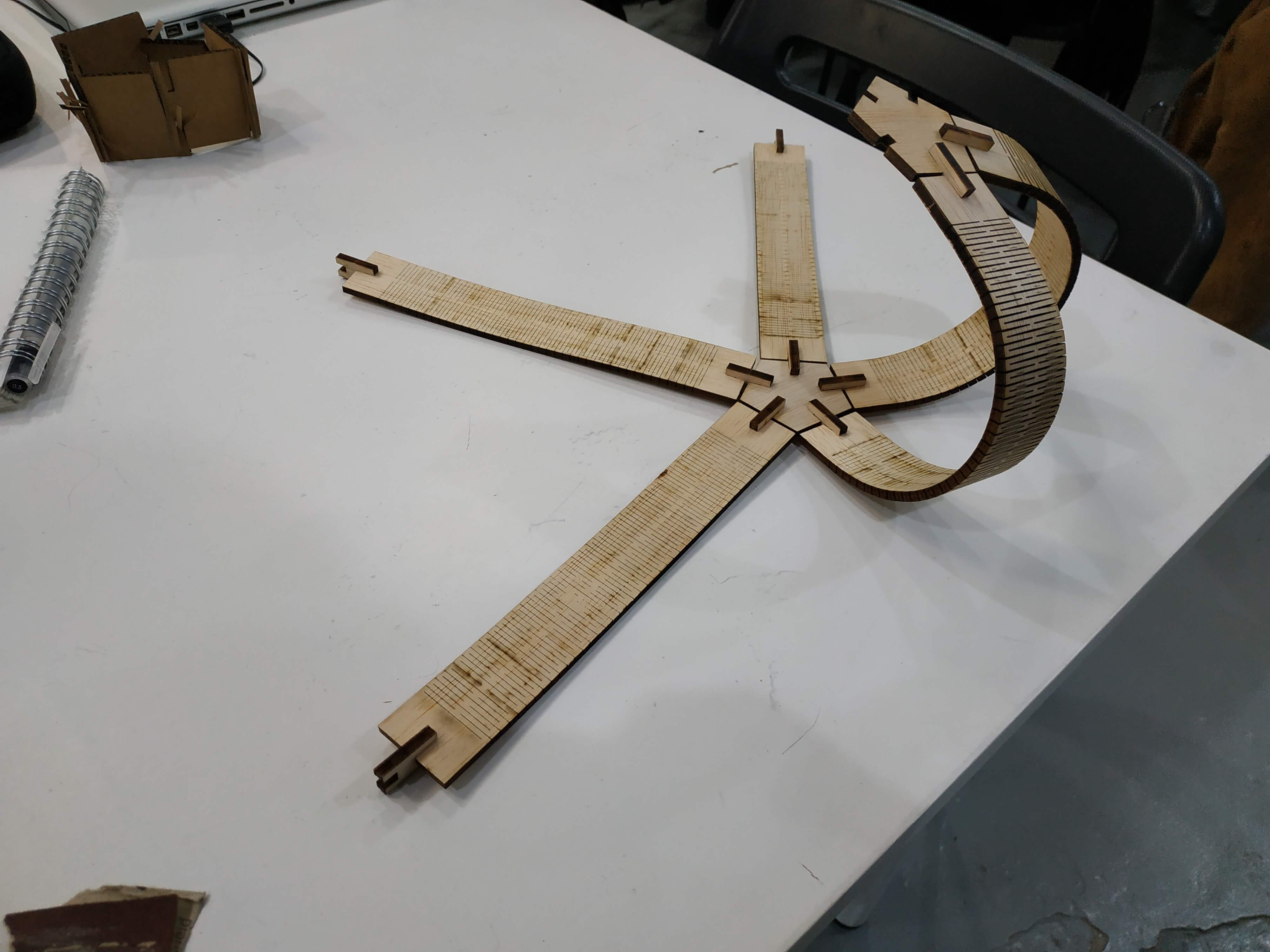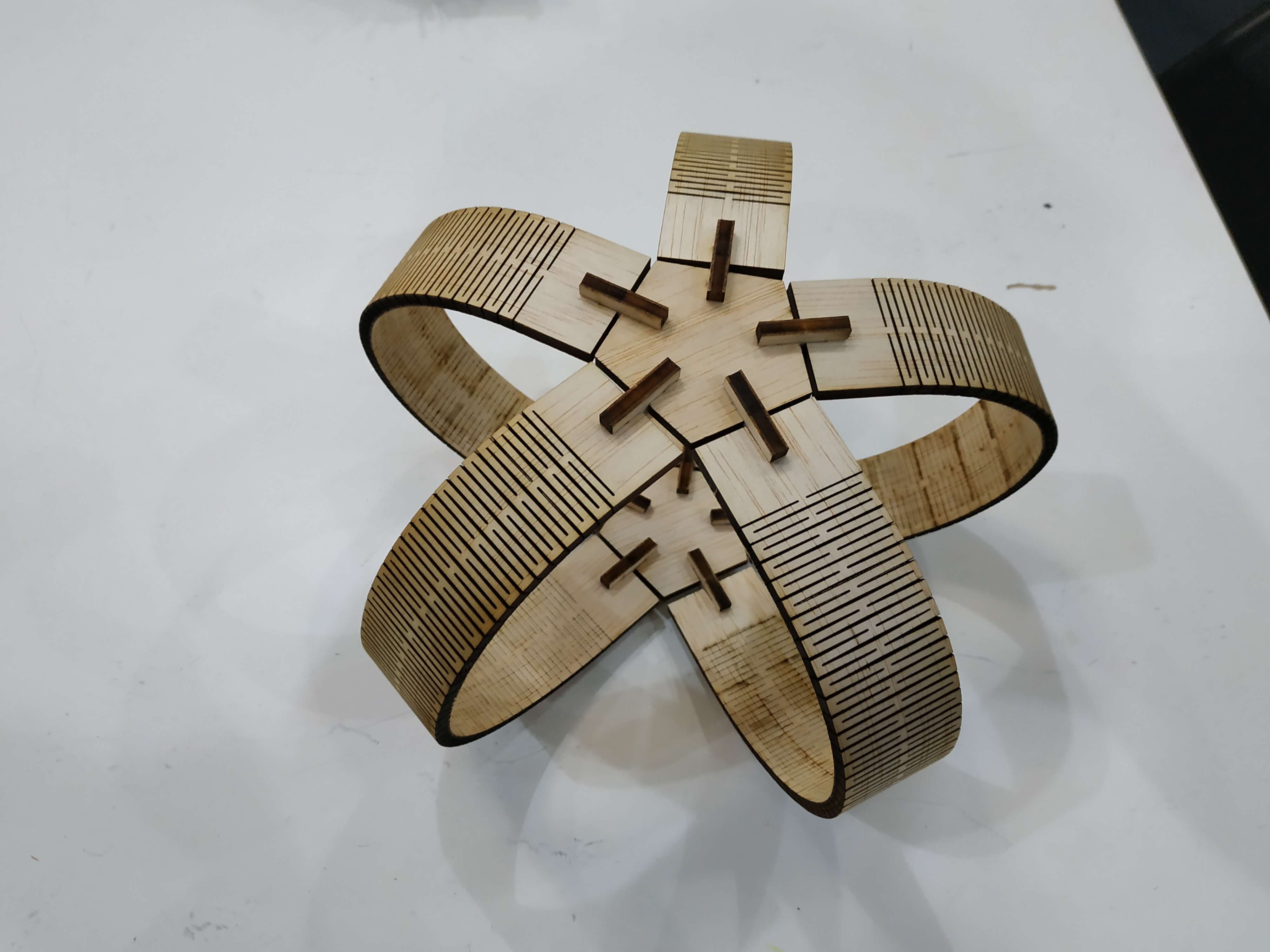 The design was made of 3 pieces, a living hinge strip, the base and a joint between them. The idea is that the strips join one base per each side creating a wood ball, and thanks to it flexibility it can bounce in one direction.