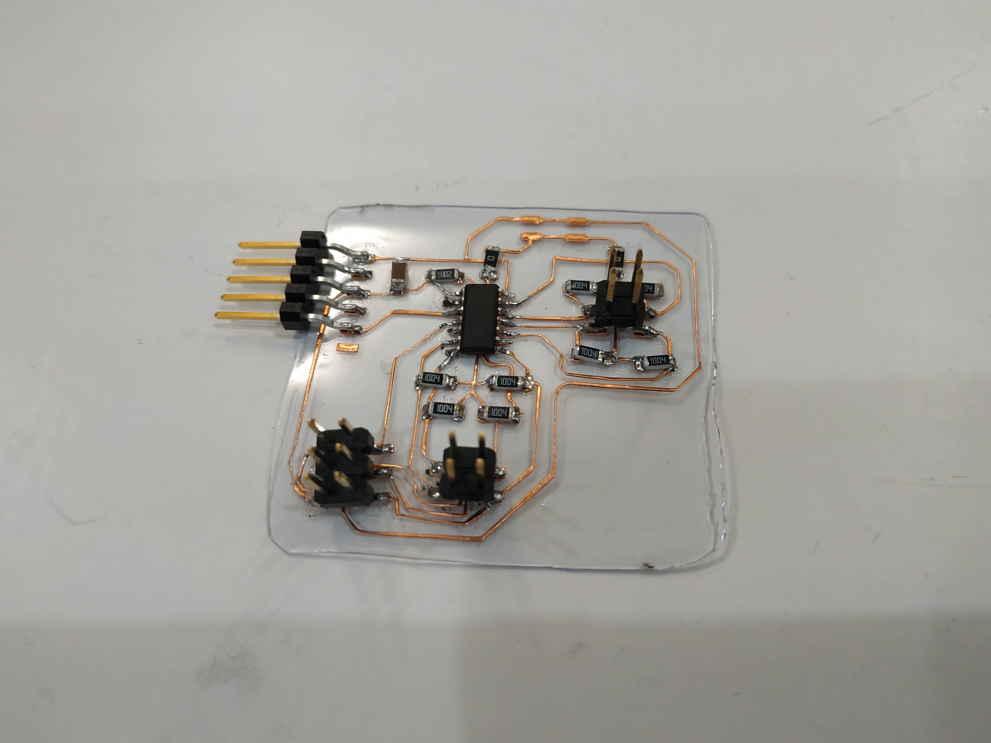The problem I detected was that the vinyl cooper was really easy to peel of the paper, so I stick the cooper first to a piece of flexible plastic. This helps to get the cooper sticked and to make it much more easy to cut. SOme tests are needed, but the trick is to speed it down to esure that it cuts fine. The result was really good! Here it is a photo with a circuit soldered on it.