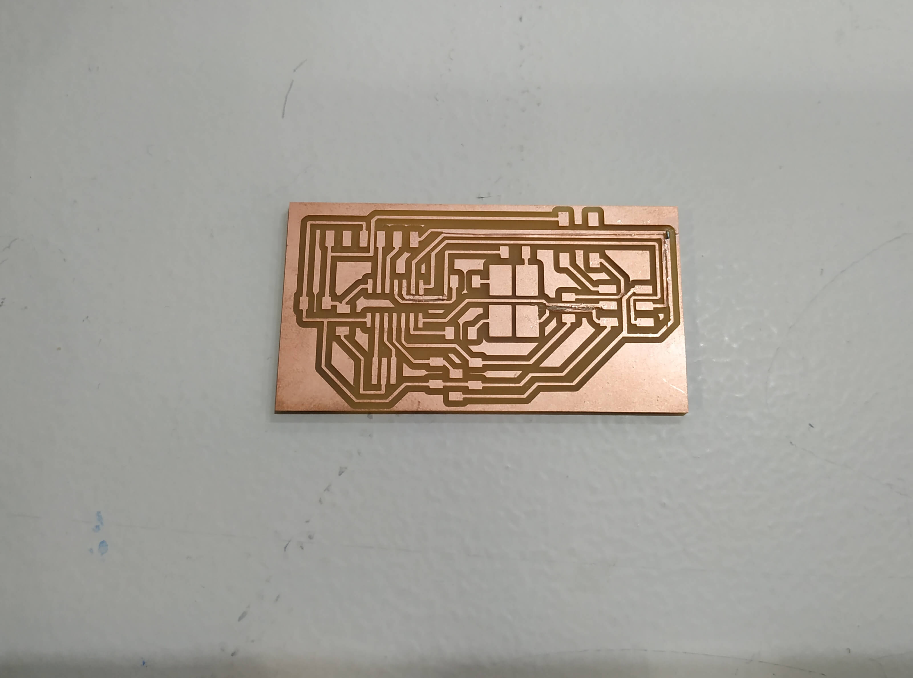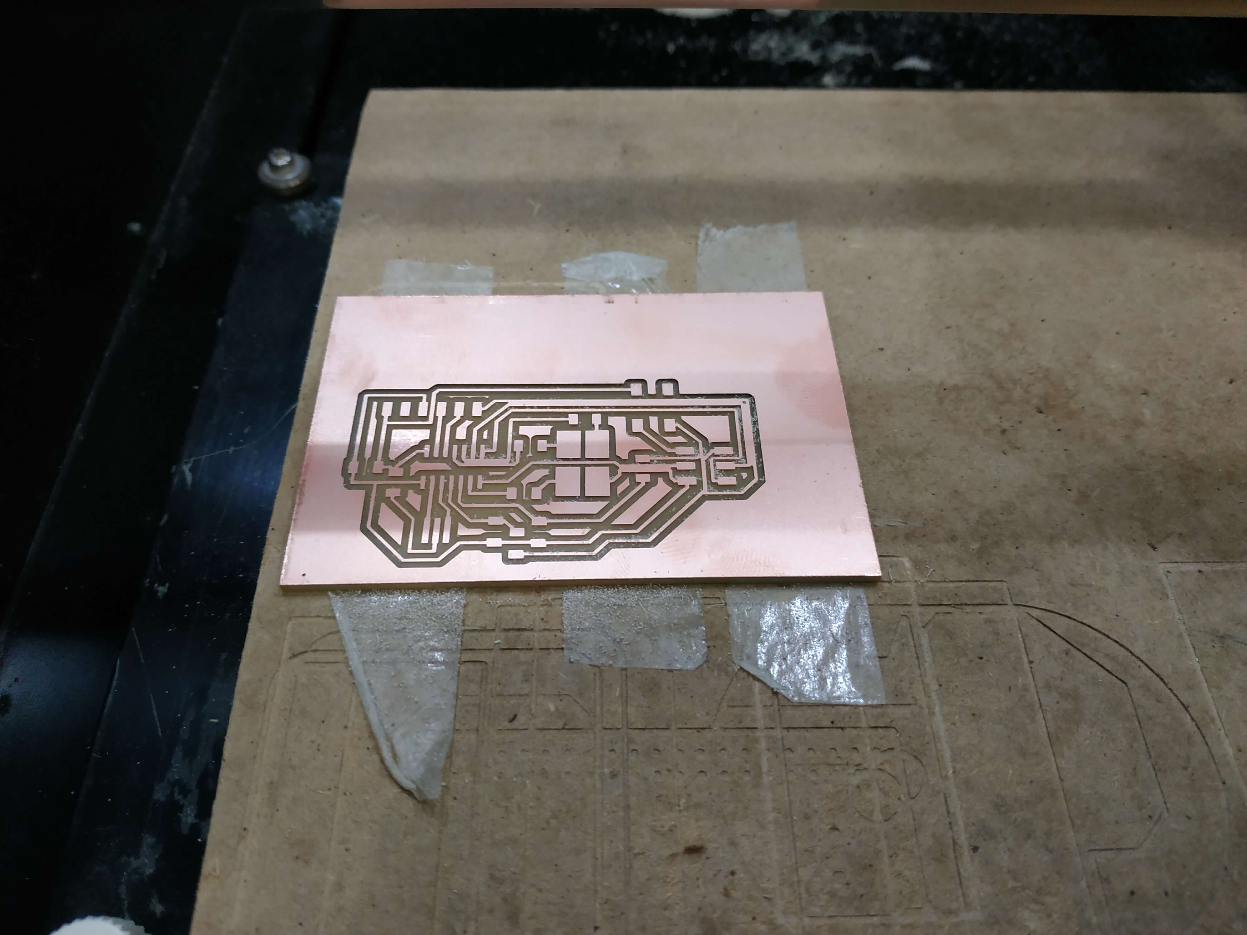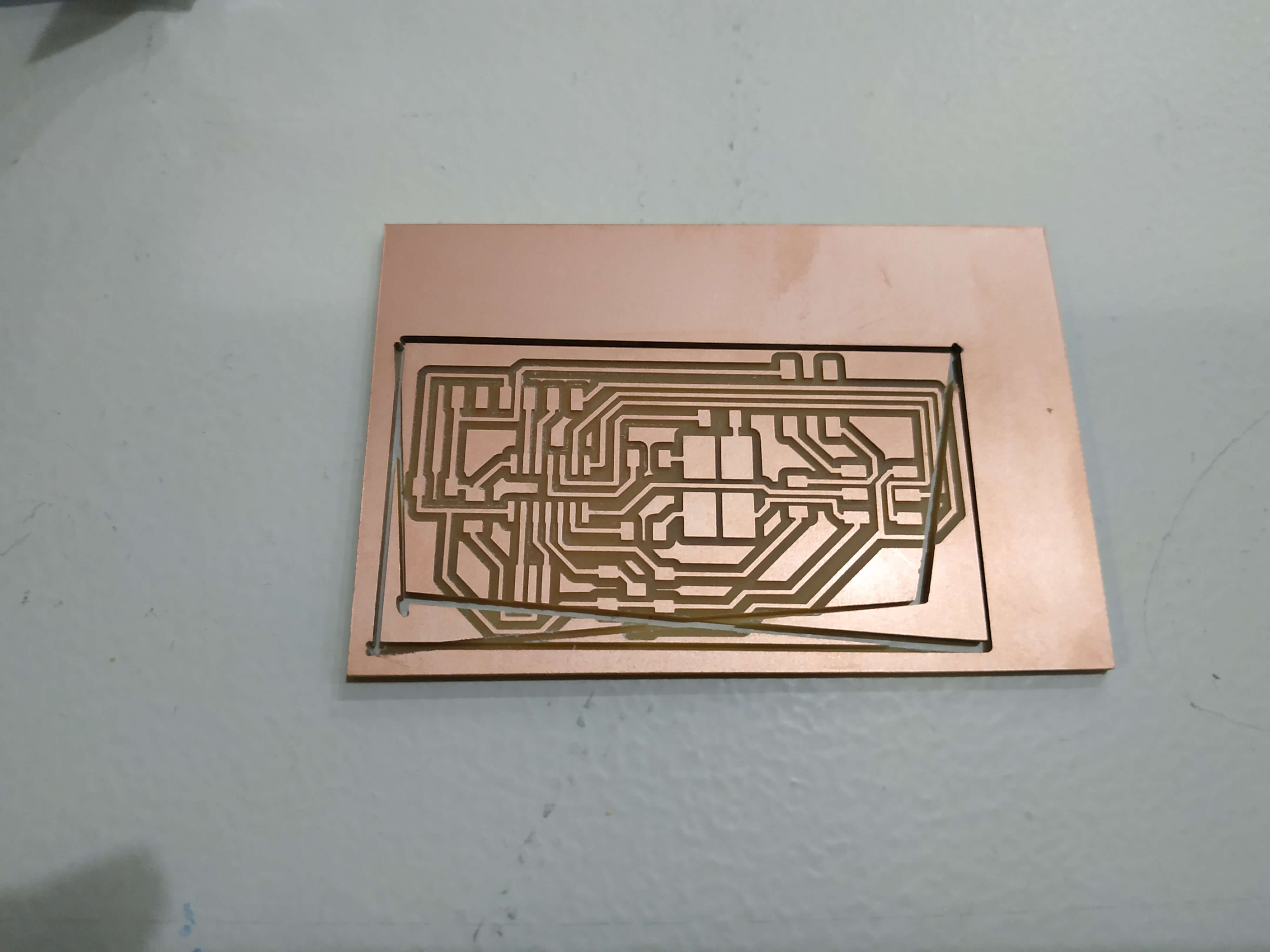 Milling the board was the most complicated part of the proces because I found some errors. The first one, as you can see in the first image I get a problem with the connections in Kicad as there were really close and the milling machine didn't go througth them, so I try to separate them with a cutter, but it was not working.