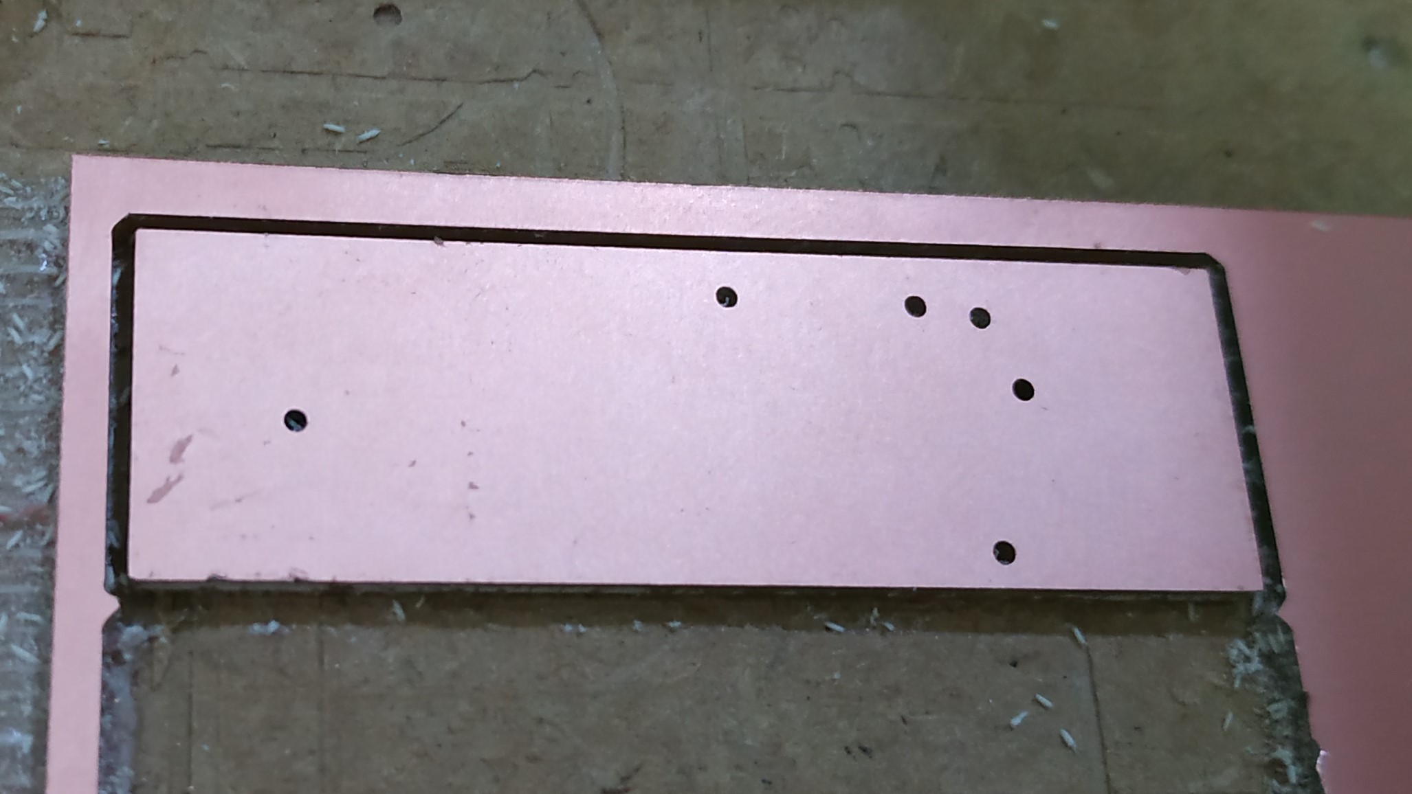 Then, after fixing the layout, I tried to do 2 round holes in the corners, but the software of the machine had a bug and after doing the outline, it doesn't read all the gcode lines and cut my board like you can see in the second image. Eduardo Chamorro fixed the problem increassing the wait time between reading commands, and finally I get the correct board.