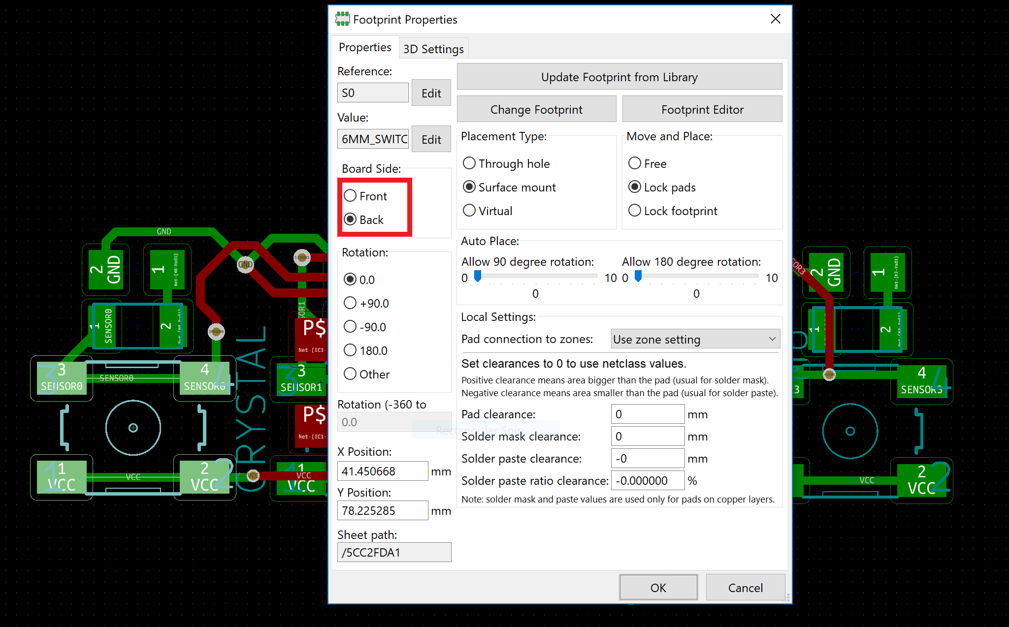 It is really easy to design the two sides of the board in KiCad, you only need to select the element that you want to place in the back layer, right clik and select properties. There is an option to select Front or Back. If you select back, you will see that it turns green and it mirrors the footprint as it is in the other side of the board. This is correct and you will have to think about it later. Here is an image of the properties menu: