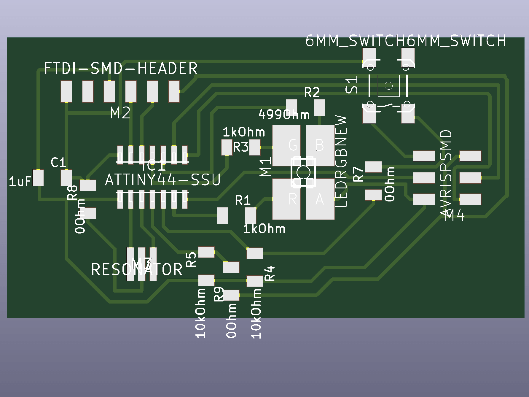 With the design done, the next step is to import it to SVG and create the PNG images with Inkscape. Note that it is necessary to mirror the back side to have the correct paths, I did the mistake of mirroring the front part and then I realized that I had the footprints wrong, I couldn't solder the ATtiny44, it needed to be fliped.