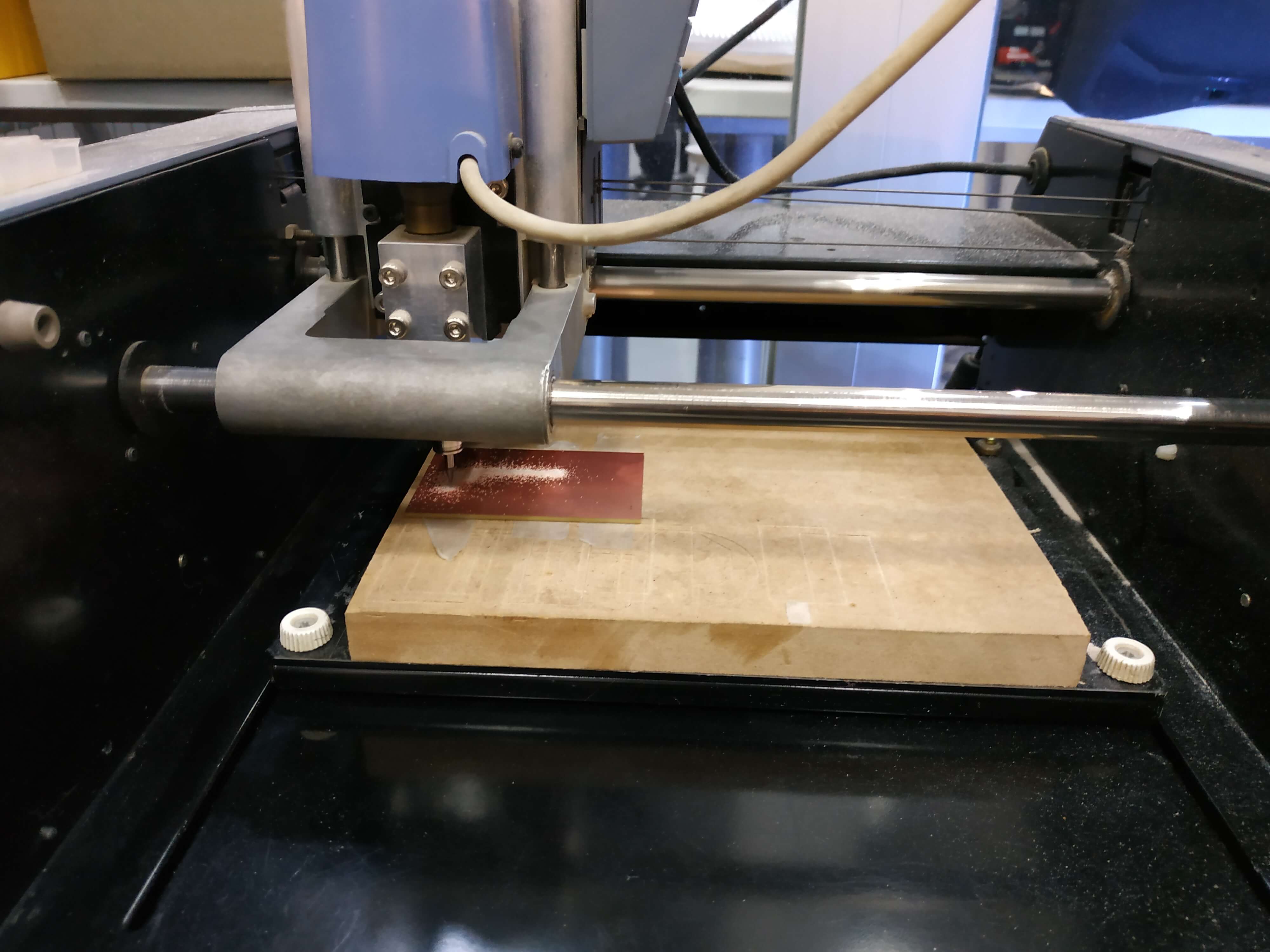 Now it is time to mill the board! This time I decided to use the Rolland MDX-20. That was easy, I exported the traces images from Kicad, then in Inkscape I separate the outline cuts from the traces exporting 2 PNG's and bring them to Mods as we saw on Week 04. Then pass it to the machine and mill it! First the traces with the 1/64 inches mill and then with the 1/32 inches.