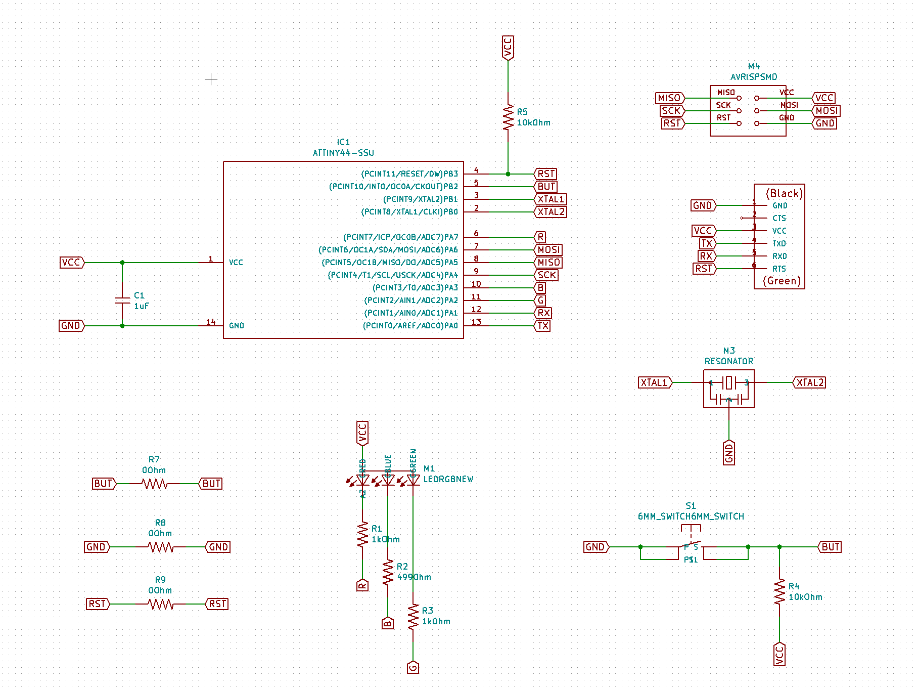 As I wanted to use an RGB LED, I needed 3 different resistors for each LED, because inside the component there are 3 LED encapsulated. Looking to the datasheet, I saw that the resistor needed for the Blue LED is different than the others, because it needs more power to bright like the others so the resistance have to be smaller. Using a 499Ω resistor insted of the 1kΩ is the solution to it. Also, it is important to use pull-up resistors for the switch and for the Reset pins, to protect it from little currents or bouncing. This is the final result: