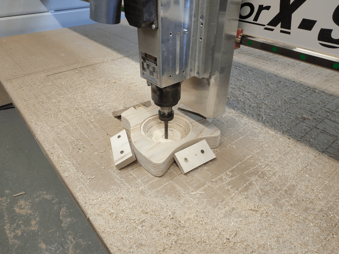 Put my glasses and ear buds on and start the work! Allways stay looking at the machine to ensure that the cut goes well and there is any prolem. Also, for security reasons, I took the dust collector out of it's place to ensure it doesn't collide with the wood doing the 3D cut's.