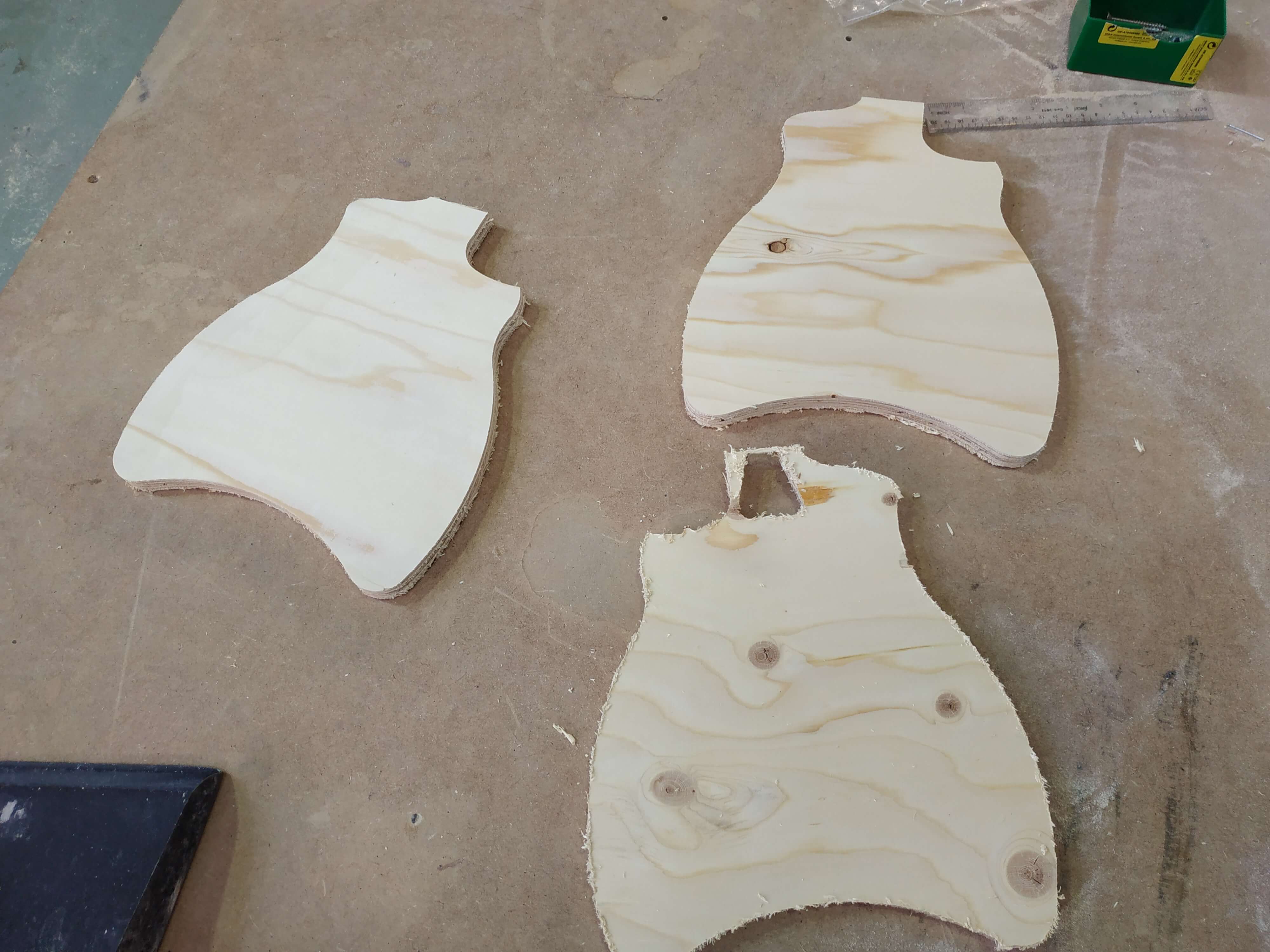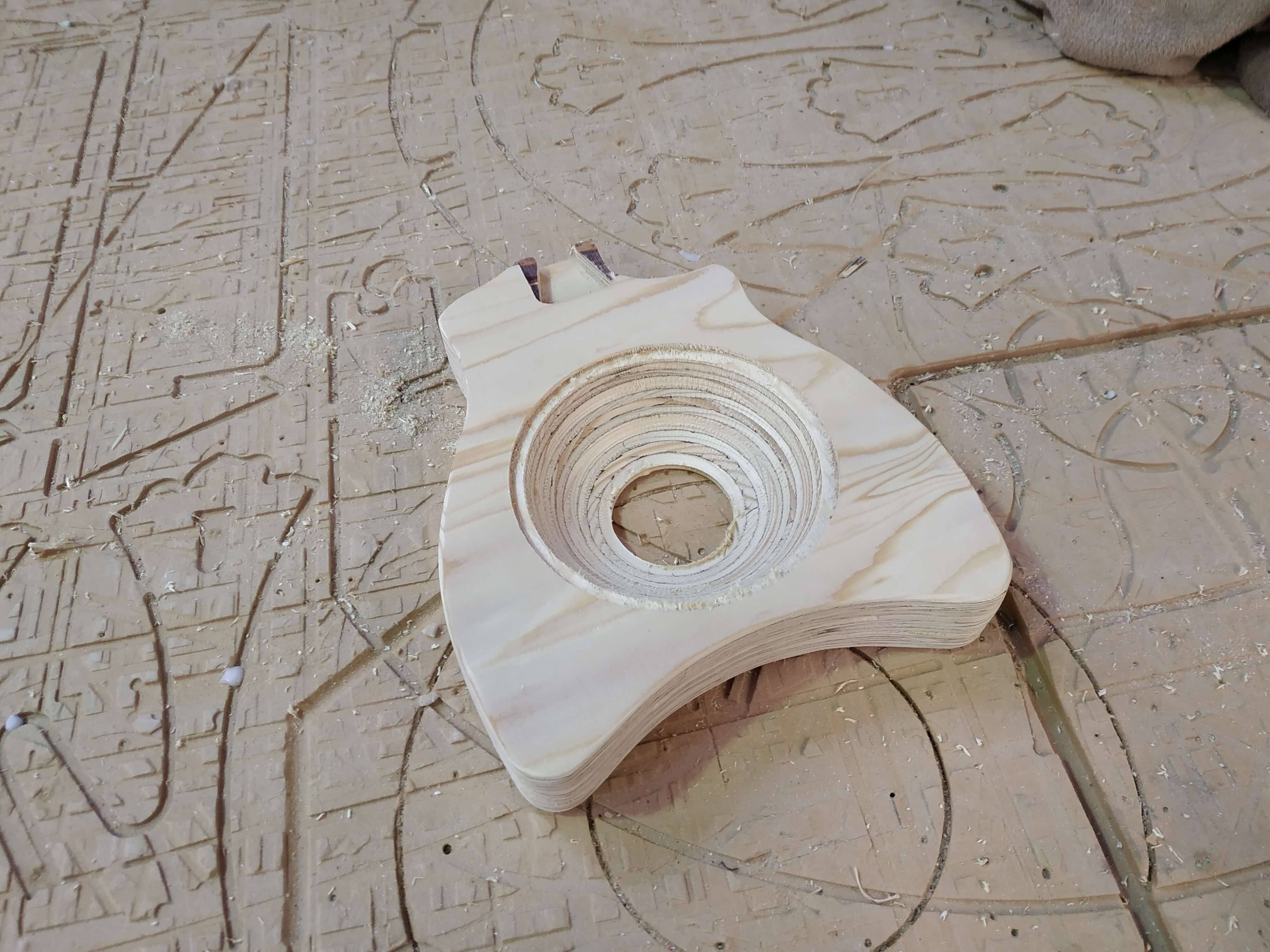 Finally, with the body glued, I did the 3D cut inside the body using a ∅6 mm flat end mill for the rough cutting first and then a ∅12 mm ball end mill for the finishing. Note that I used four pieces of spare wood to fix the body to the table.