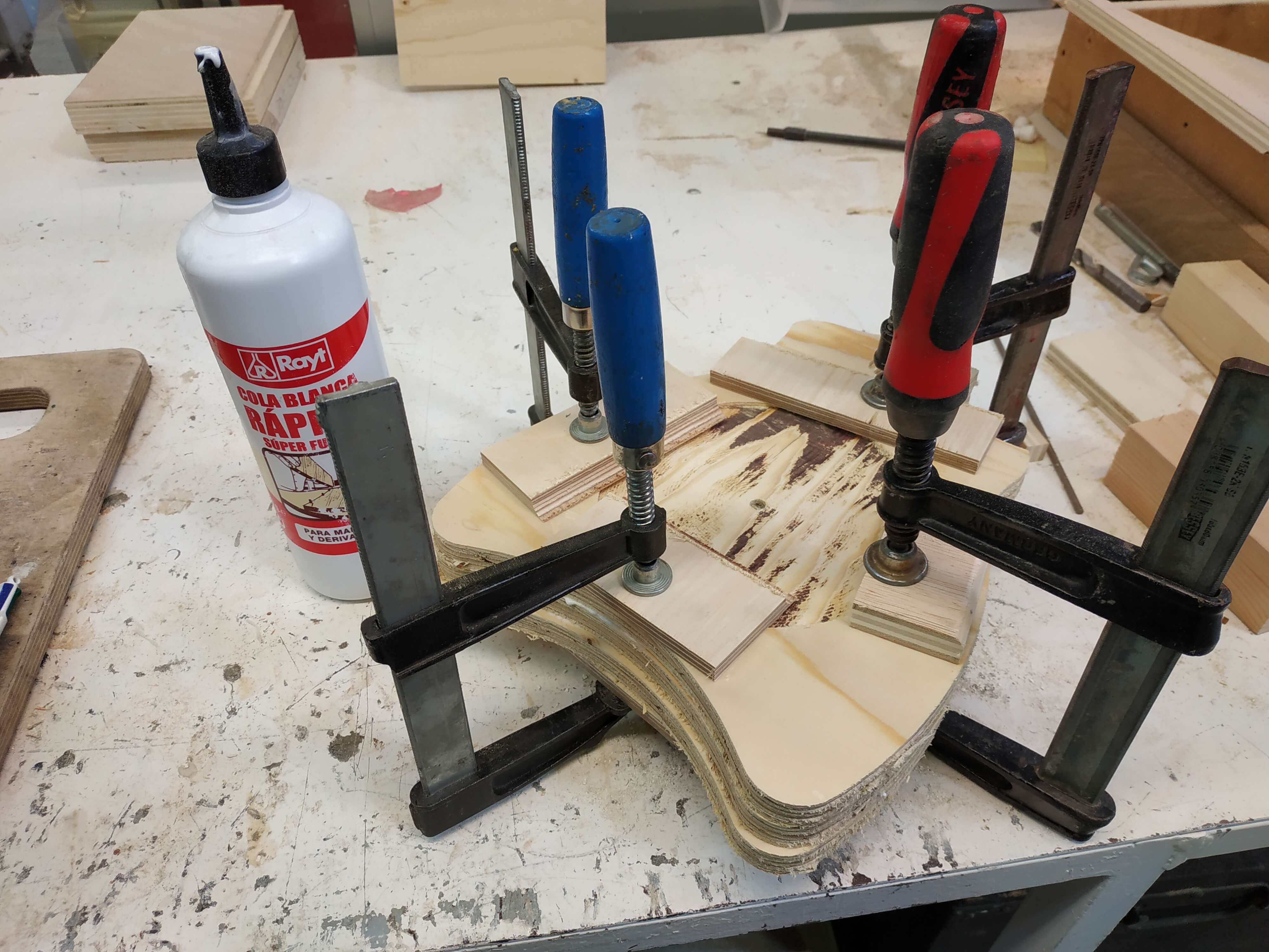 After milling the different parts it was time to glue the pieces together with white wood glue and clamps to hold it together for one day. Also, I decided to start with the sanding process to get a better finish of all the instrument.