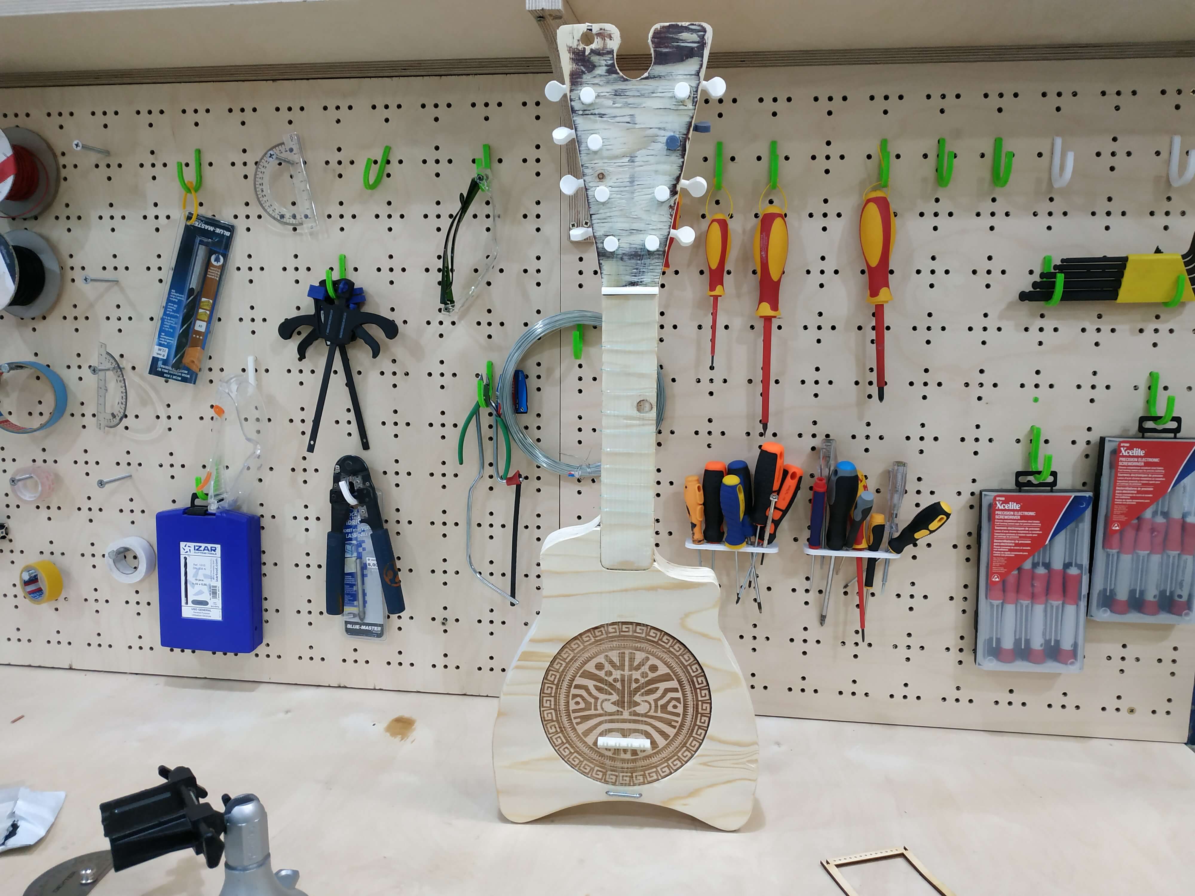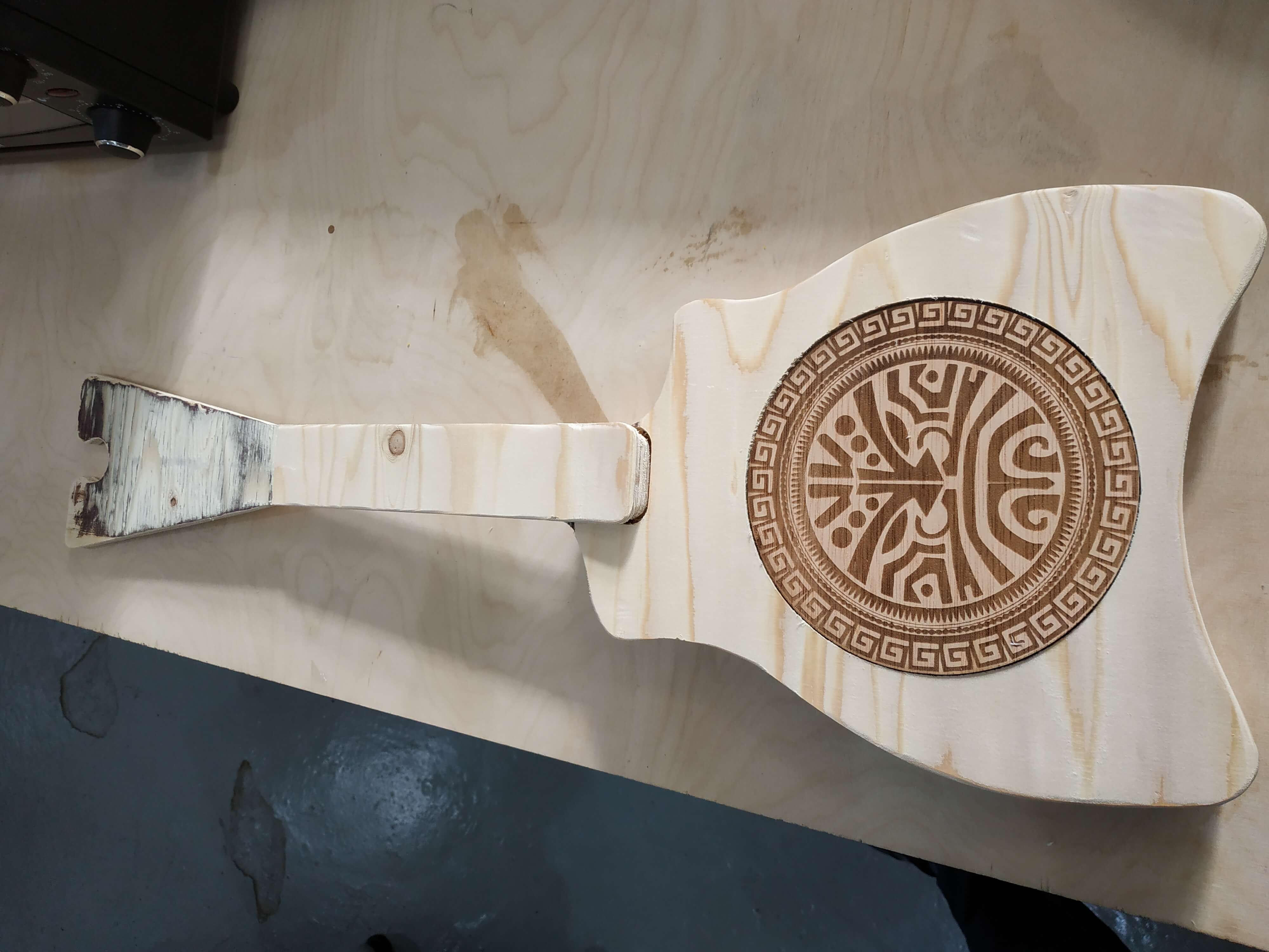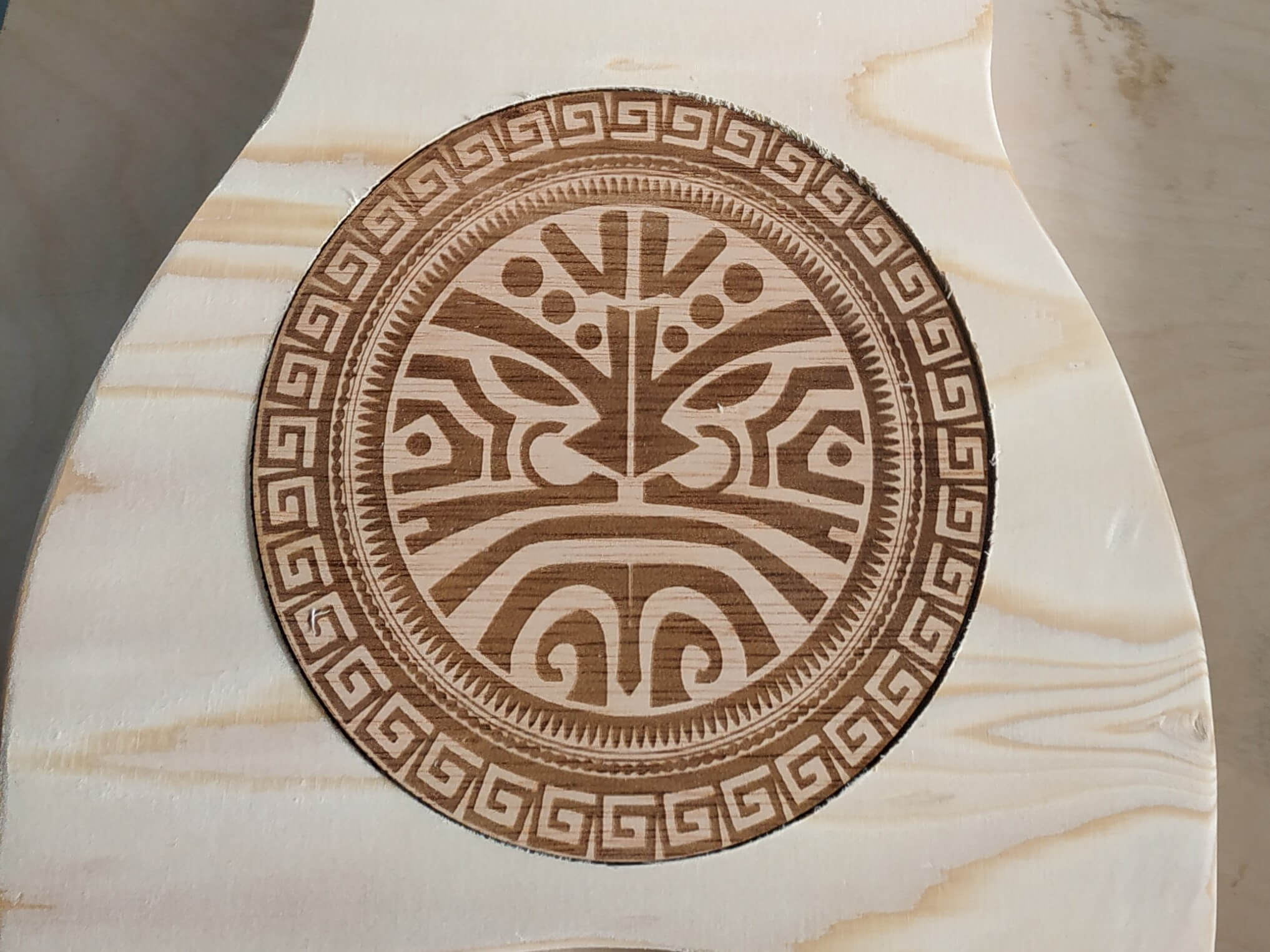Once the instrument was done, it missed some important parts and I decided to produce them with other technologies that we have learned during FabAcademy. First of all I decided to laser cut and engrave a circular wood cover for the resonator hole. I decided to go for a Tahitian engraving to honor their roots. In the other hand, I used the 3D printer to procude the nut and bridge to hols the strings above from the neck and also the tunning pegs, using a model from thingiverse and changing a little bit it's design. For the strings I used 40 lb fishing line as the tradition says and I also used it to make the frets tacking some inspiration from the Bağlama where they use fishing line to make intermediate frets.