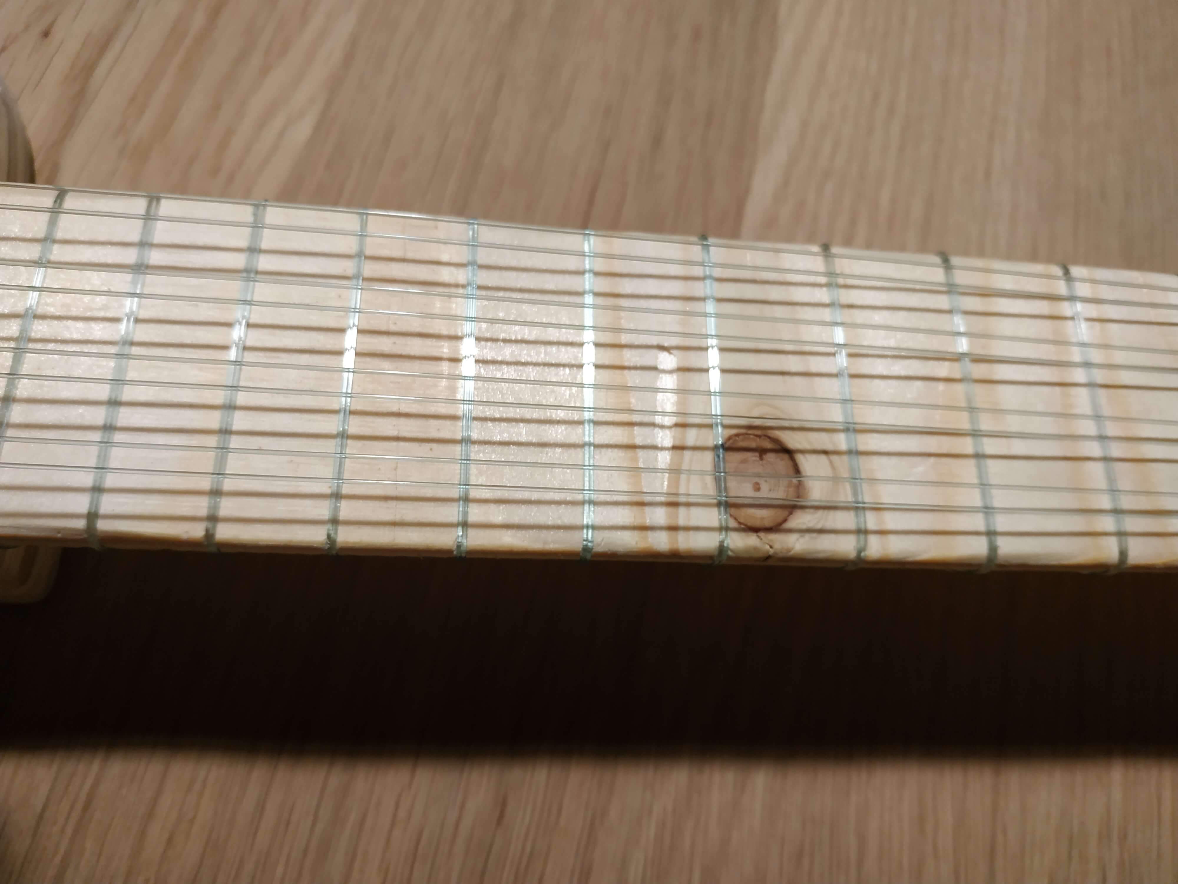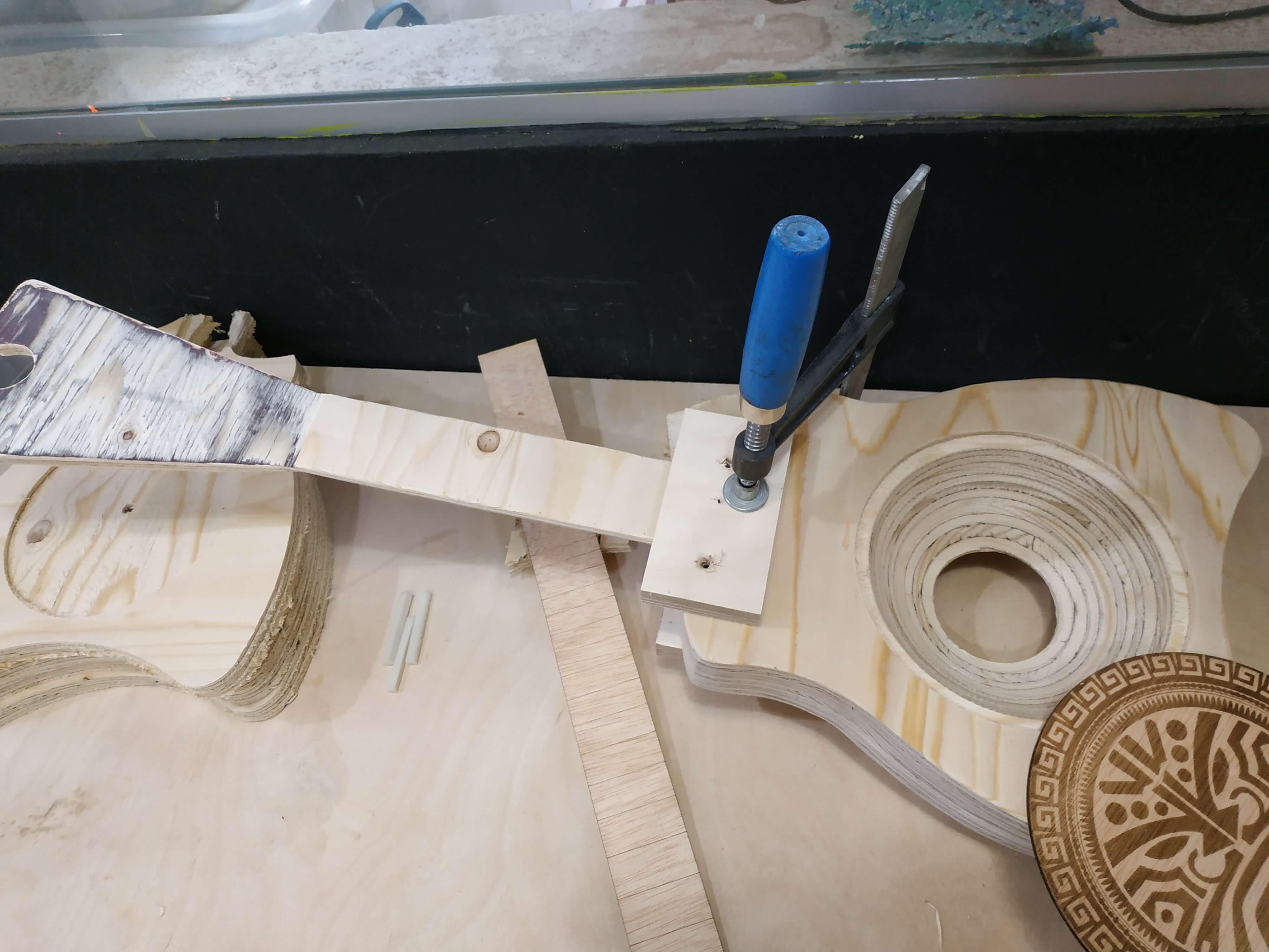 For the neck I tried another technic. As the thikness was more than 15 mm I decided to try to glue two pieces of wood and then cut them together this time. So the first step was glueing the two pieces.