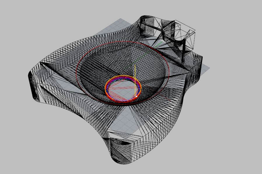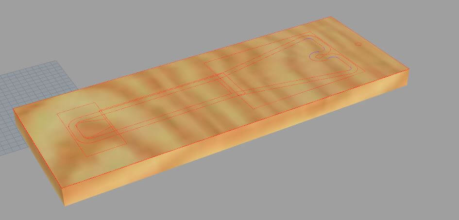 The second side was much more interesting, it has a 3D shape, my first 3D mill. To do it I needed to import the 3D model in Rhino and put it inside the Box Stock shape to create the 3D milling operations. It will automatically detect the mesh and create the tool path.