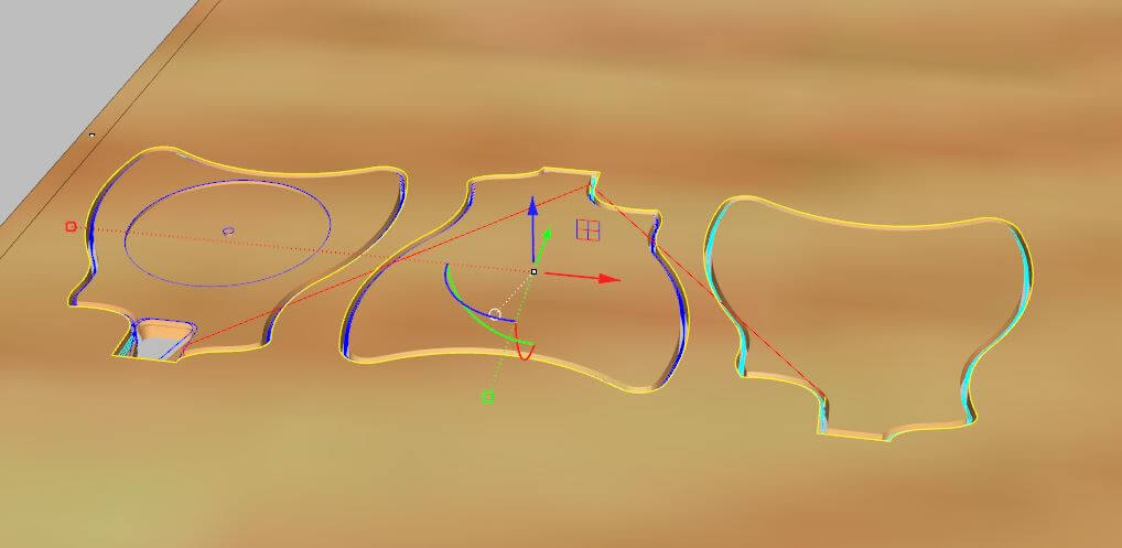 To create the file, I exported the Fusion 360 sketches as DXF and then imported to Rhino. A nice strategy is to change the colors depending on wich type of operation is it for, pocketing, profiling or engraving. I started with the body of the Ukulele. As the thikness of the body needed to be more than 15 mm (the thikness of the material), I decided to use 3 layers, cut them and glue it together. Also I did a pocketing of the hole to know where the center is and then 3D cut the real hole of the whole body.