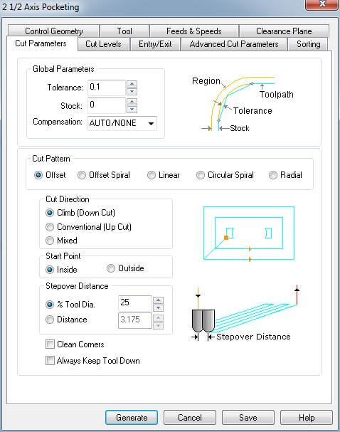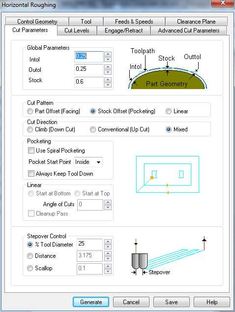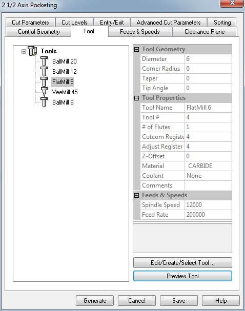 For this operations I used a ∅6 mm Down cut Flat end mill. It was the same used for the group assignment, so I used the feed's and speed's that we found. They where calculated with the Chip Load Calculation Feed Rate = #Flutes · ChipRate · RPM, it was a 1 flute mill and the Chip Rate was between 0.28 and 0.33 as Plywood is considered Softwood. The result was 18000 RPM and 5000 mm/s. This are the parameters used for the pocketings: