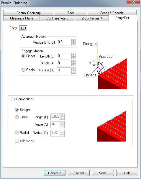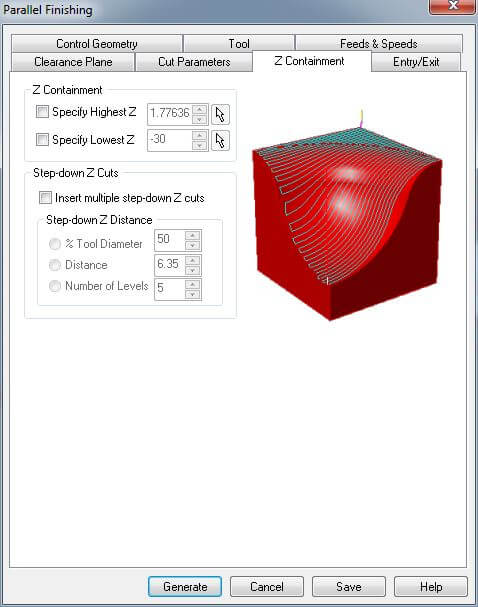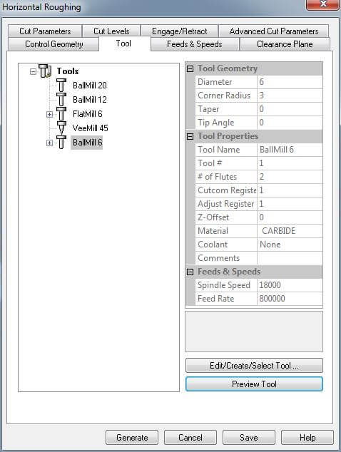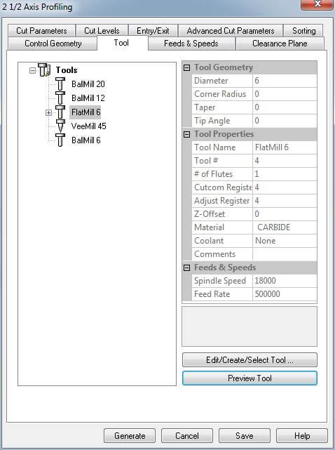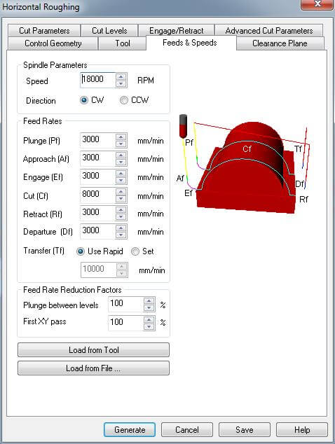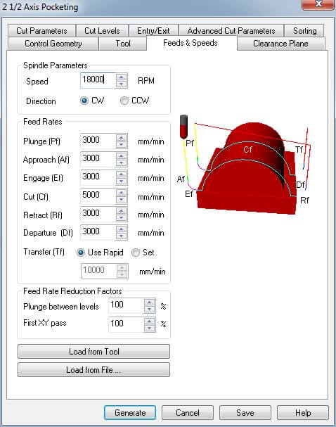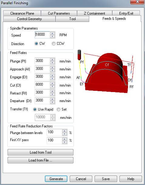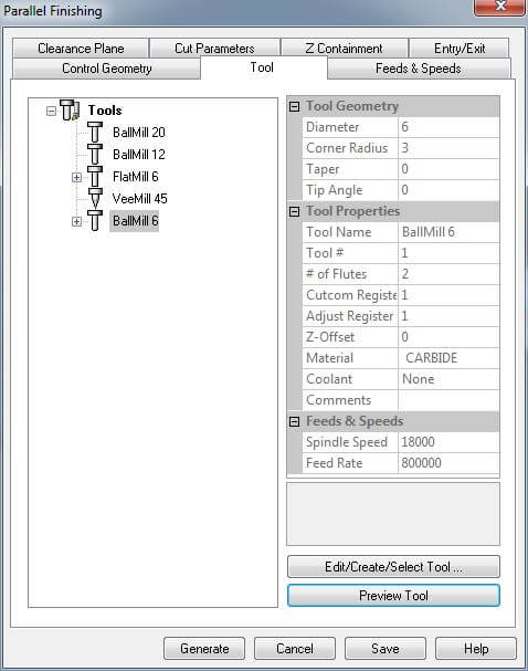 In this case, I used a ∅6 mm flat end mill for the roughing and a ∅6 mm ball end for the finishing. The feeds and speeds for the roughing were the same as the previous ones, but as it was a 3D cut it was important to set well overlap and the cut depth. I used a 30% of the tool in both cases to not force the tool to much. Then with the finishing, I had to calculate again the feeds and speeds. In that case the end mill had 2 flutes so for 18000 RPM the speed was 10000 mm/s. It was too much speed and the machine had a high speed spindel and we cannot reduce the RPM's, so, with the lab manager, we decided to set a 8000 mm/s base speed and increase it during the execution if necessary. Those are the parameters used: