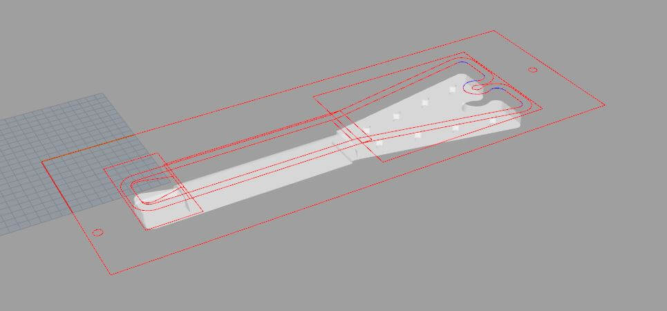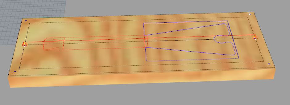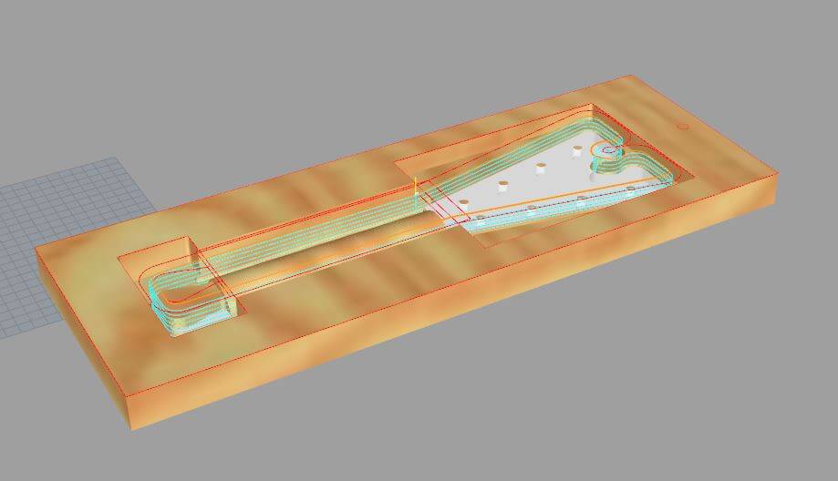 Then I did the CAM file. This was the most difficult part, because it needed a two side milling for the head of the ukulele and a 3D milling process for the round part of the neck. The first side was only a pocketing to make the head lowwer than the fets, and two holes that goes a little bit through the sacrificial board to be able to center the board after flipping it to mill the second side.