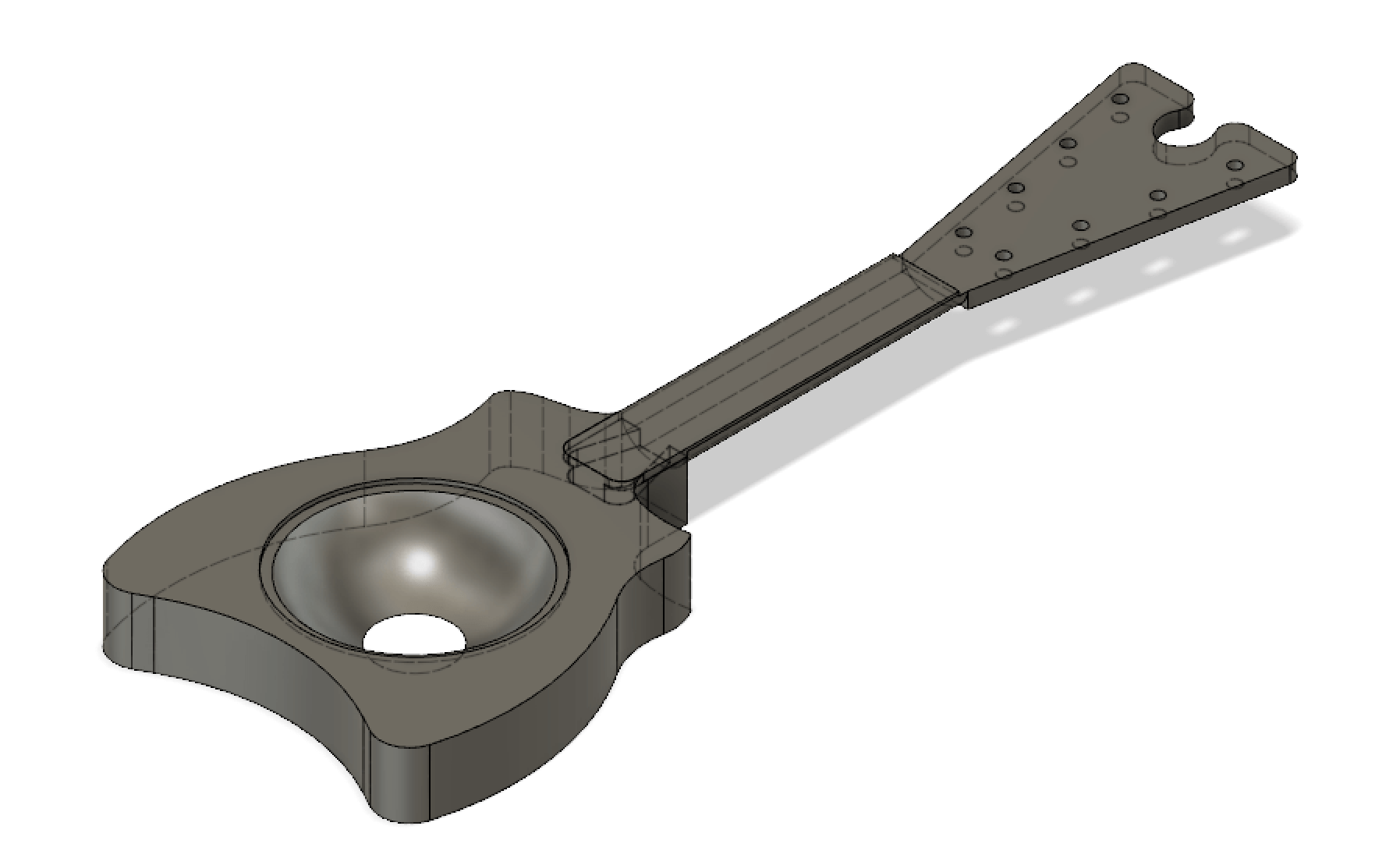 I design it with Fusion 360, I tried to keep a nice shape for the body and giveing it a 380mm freat scale like the concert Ukuleles. To learn about wood joinery I decided to divide the ukulele in 2 parts, the neck and the body, and join them with a hidden join. This is the design: