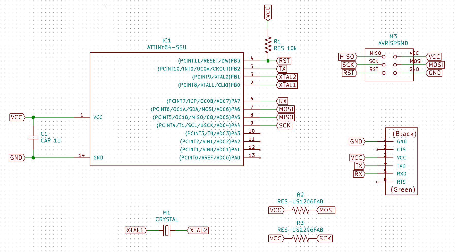 - Master Board: This board will have the ISP communication port to program the board and to make the I2C communication with the SCK pin as SCL and MOSI pin as SDA. Also, it will have an FTDI connection to communicate via serial port with the computer.