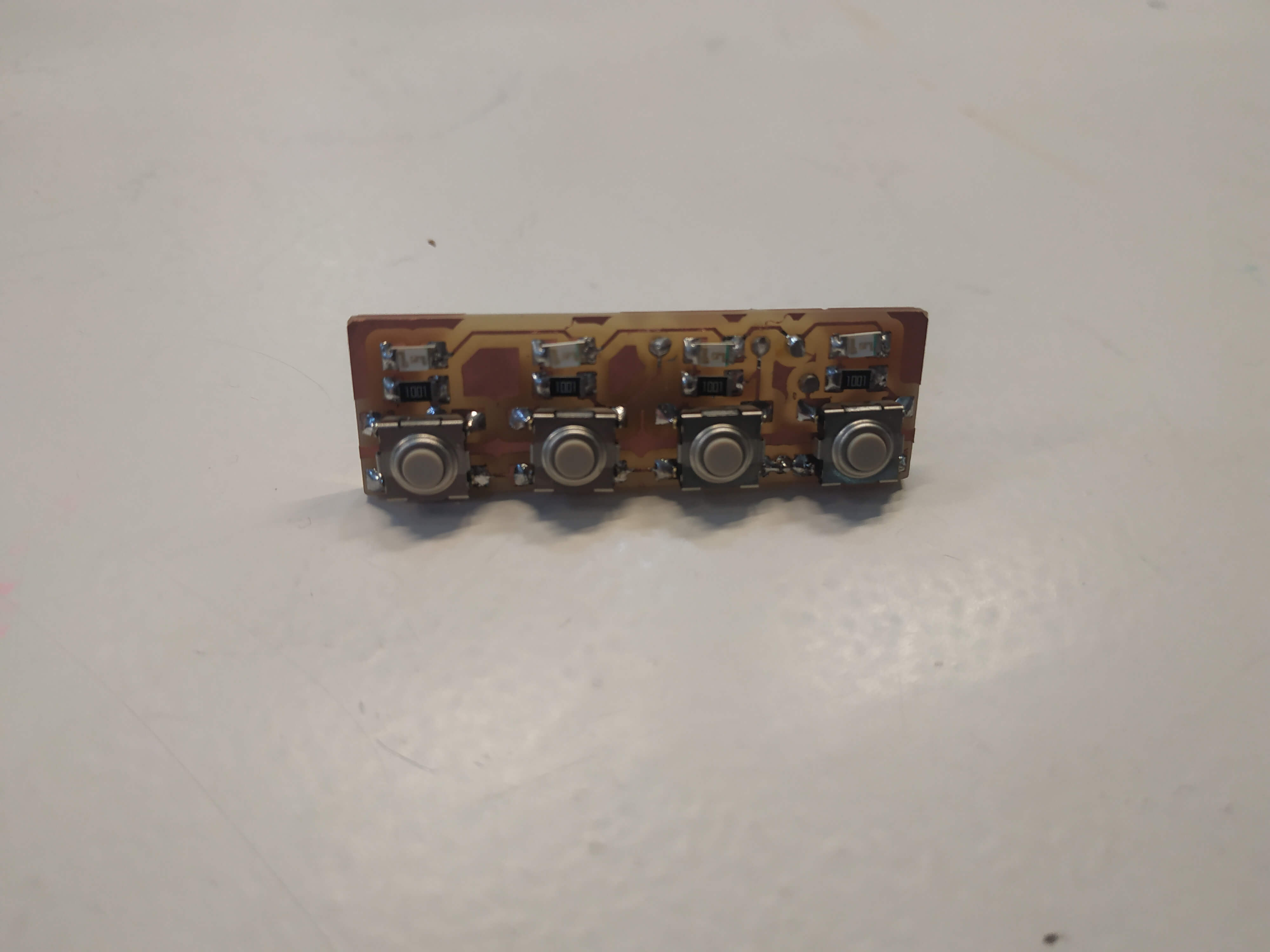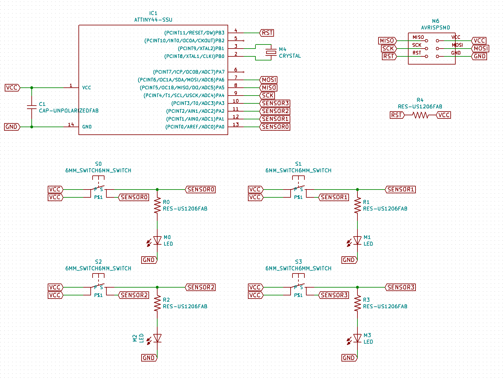 - Slave Board: There will we more than one slave boards. They have the ISP connection to program it and to communicate with the master. Then it will use 4 buttons and 4 LED's connected to 4 pins (one button and LED for each pin). The idea is to use the LED as a pull down resistor for the button so we will be able to use the pins as outputs lighting the LED and as inputs pressing the button.