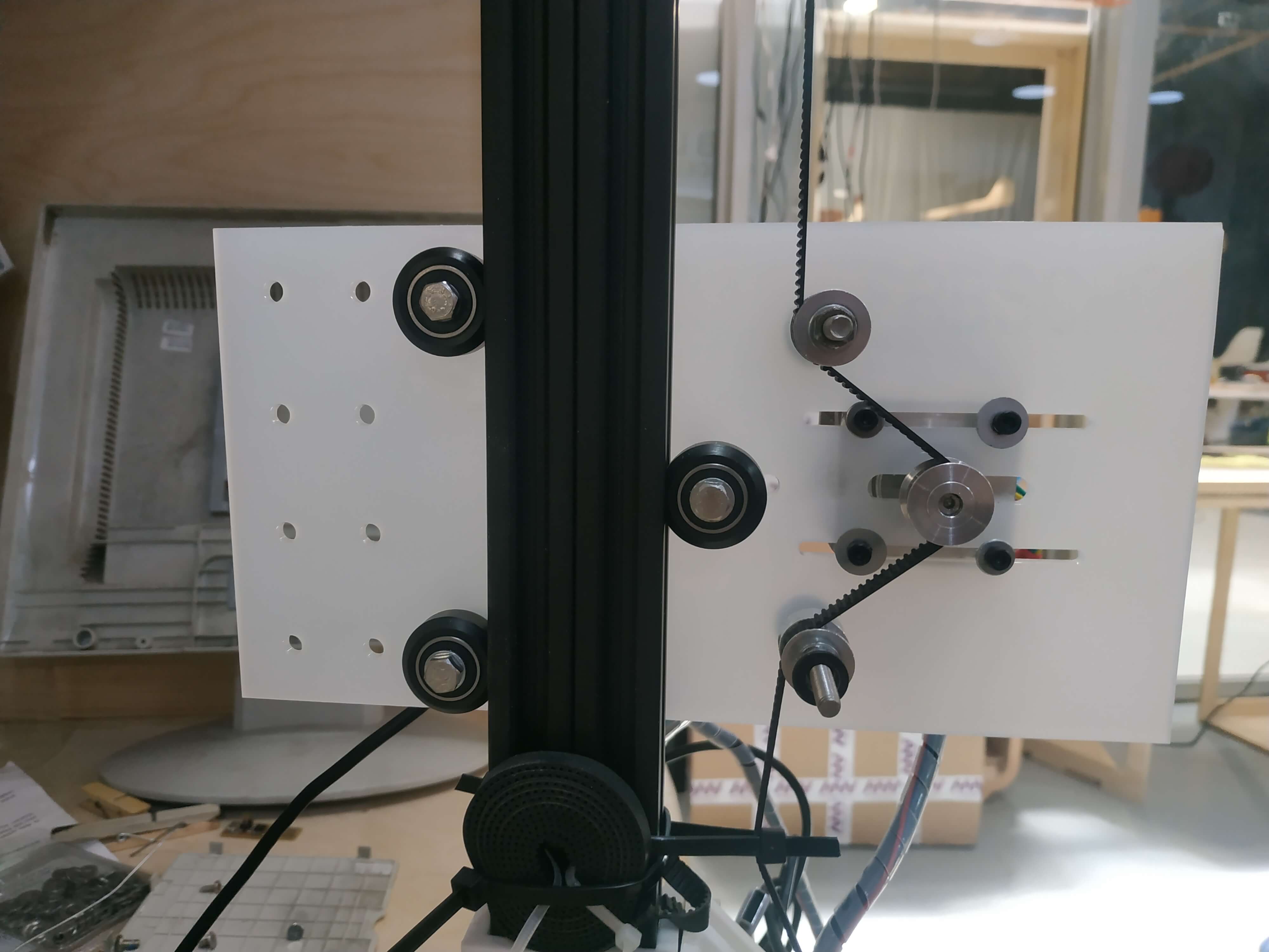 The main idea is that we apply some tension to the belt with 2 free bearings and another mounted in the motor. Then, when the motor moves, it makes all the structure go up or down following the belt. There are three bearings that attach support to the main pole. Note that we made some long holes to be able to adjust everything when assembling it.