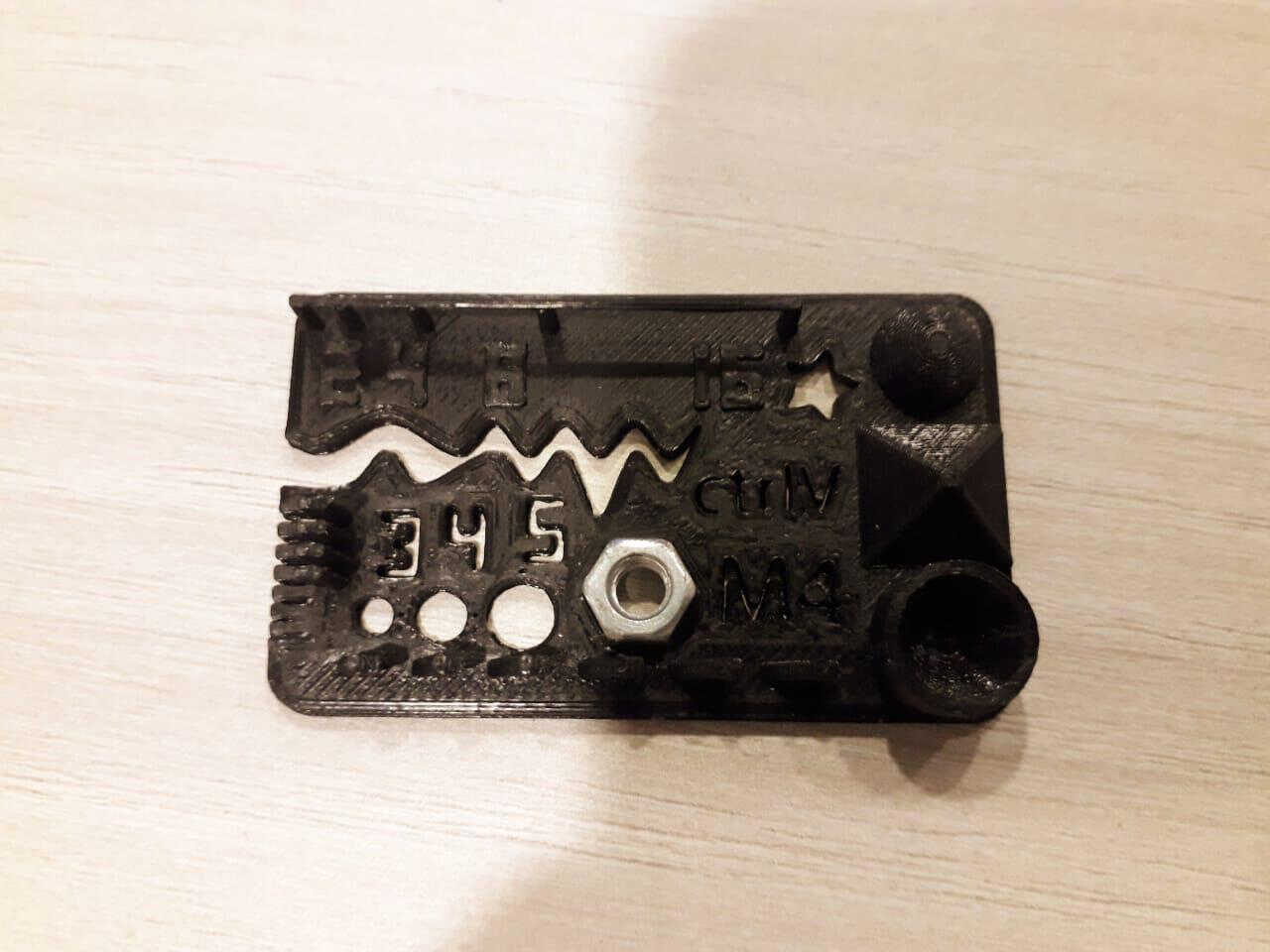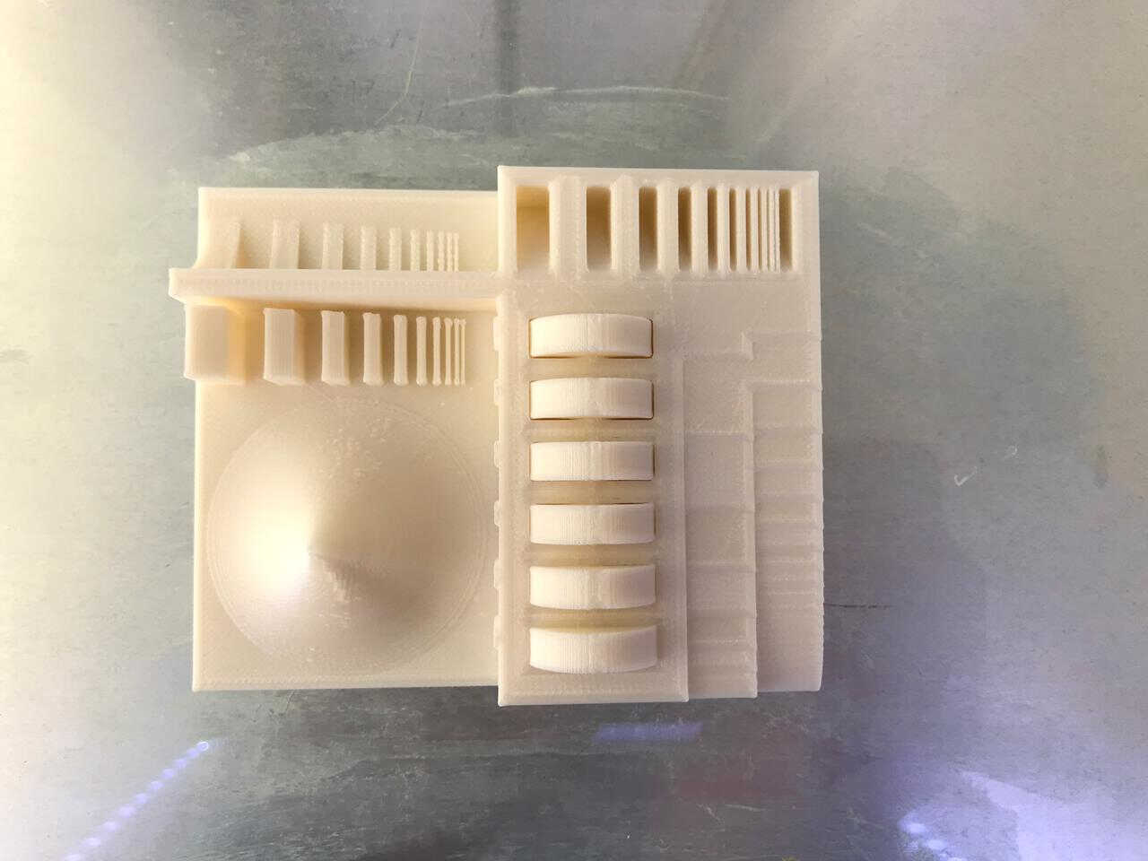 The test features moving hinges of varying tolerances ranging from 0.38mm up to 0.635mm. It also features thin walls and wells ranging down to 0.016mm