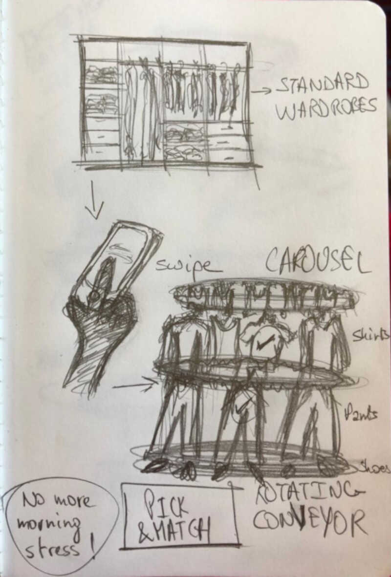 So the idea is to have a carousel or a conveyor that revolves around a center, while holding the items of clothing. There should be 4 carousels on top of each other; The first one for hats, second for shirts, third for trousers and last for shoes. Let's first refer to one of my initial sketches
