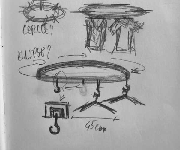 I have started by drawing my elliptical carousel that will be holding the hangers and the items. After several trials, and taking into consideration that the hanger will take around 50 cm clearance all around it, I have ended up with the above dimensions