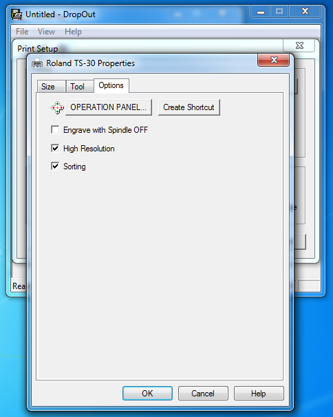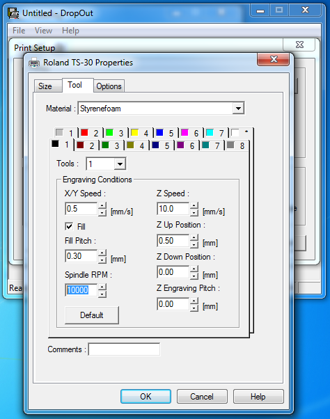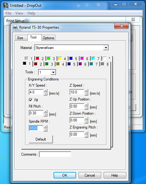 Then you may complete filling the rest of the settings. You need to select your machine and which is the MDX-40 in our case. Then your speed needs to be 4 mm/s. Your X and Y are always 0. Your cut depth is 0.1 mm, tool diameter is 0.15 mm in our case and the number of offsets is 4 (enough). As for the offset overlap, you may choose 60 or 70%