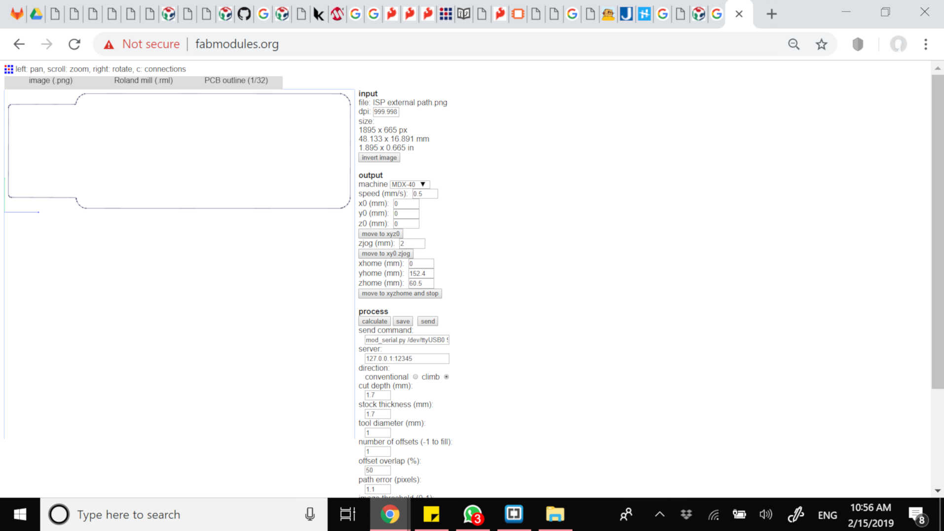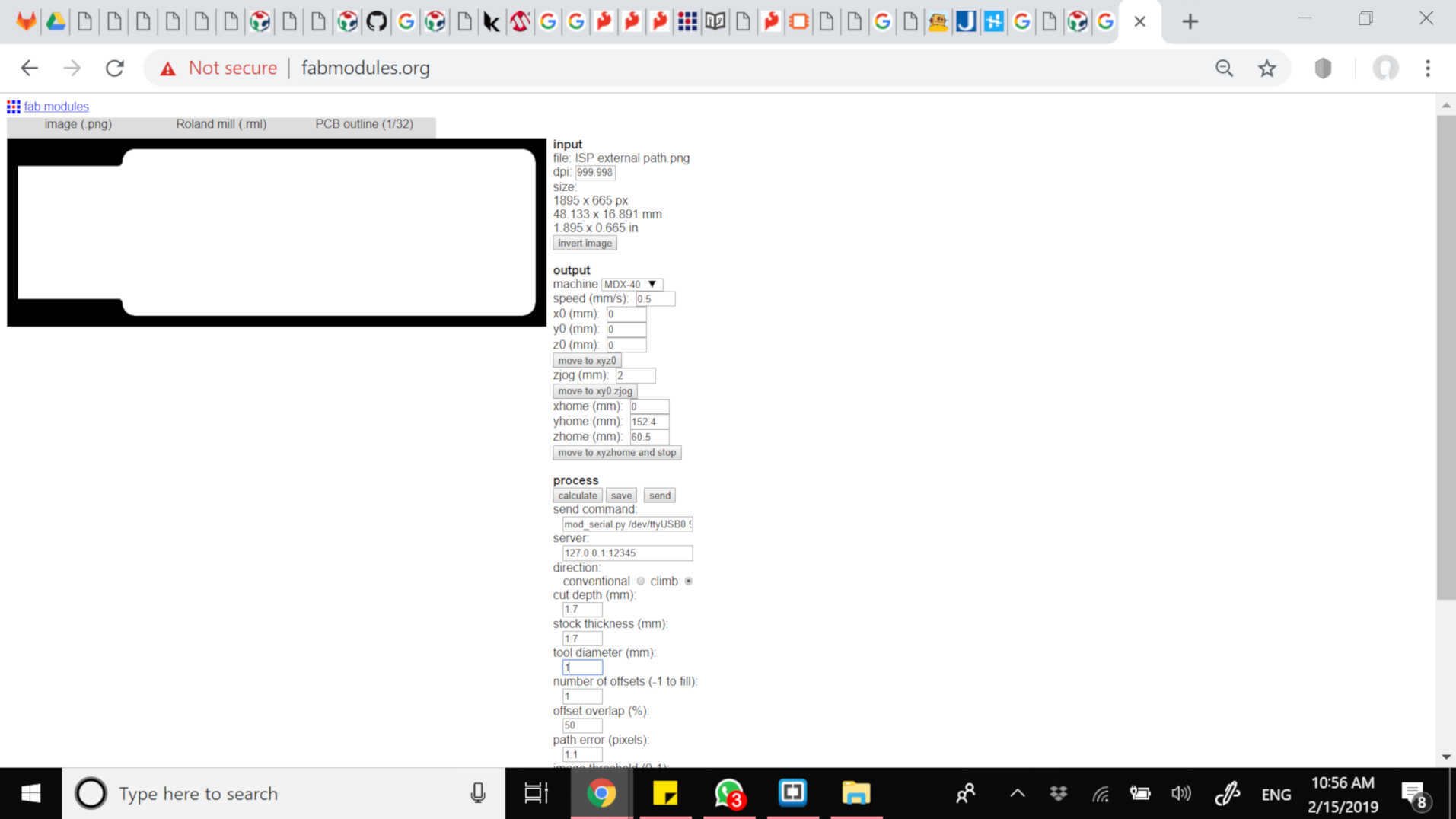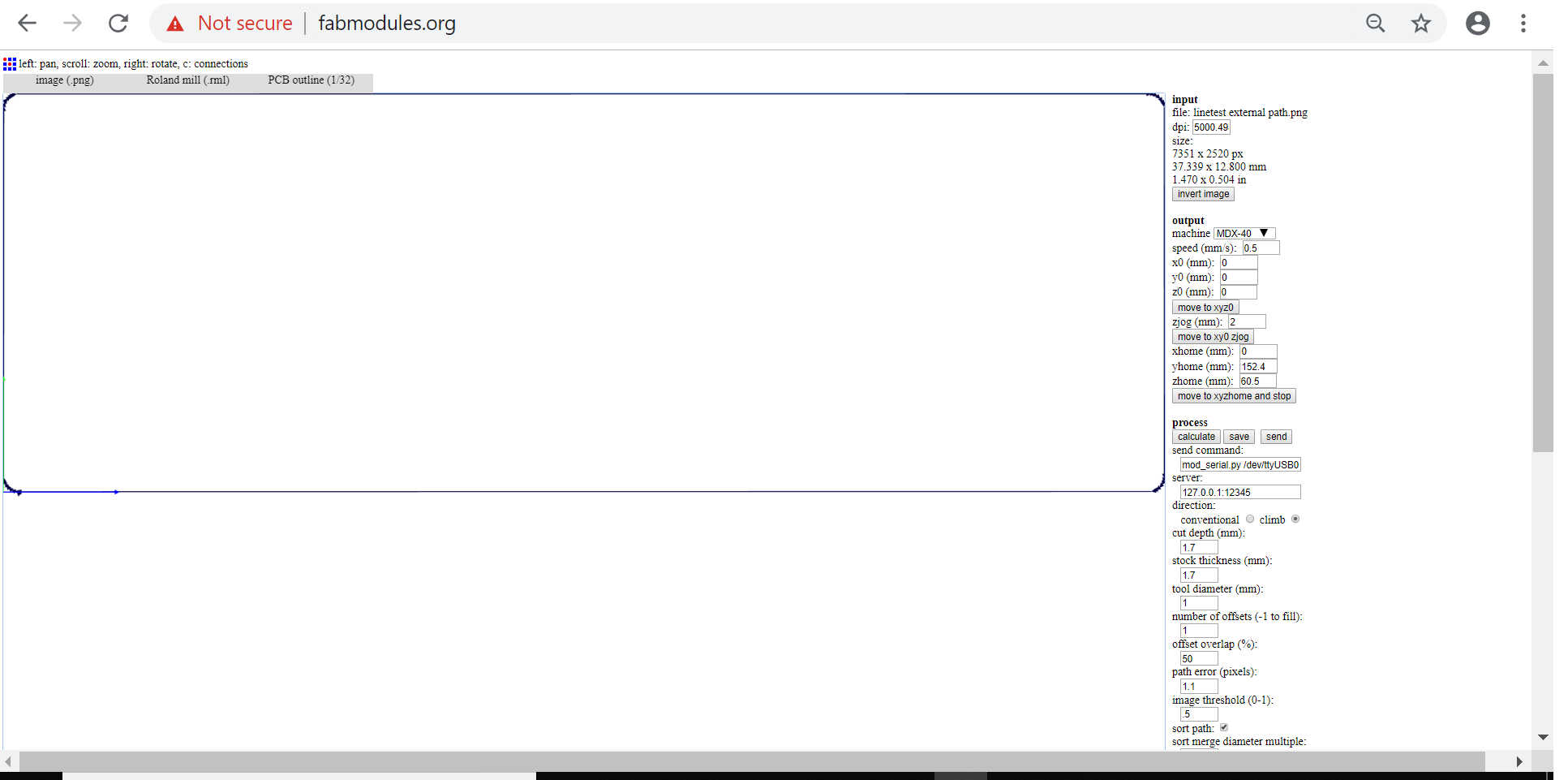 You will then repeat the same steps for the external path but you need to apply some changes. First, invert your image. In this case you need to choose PCB outline (1/32), speed of 0.5 mm, cut depth of 1.7 mm, tool diameter of 1 mm, and the number of offsets is 1. The remaining settings are like the ones for the internal path. Do not change any of the rest! And then you calculate and save
