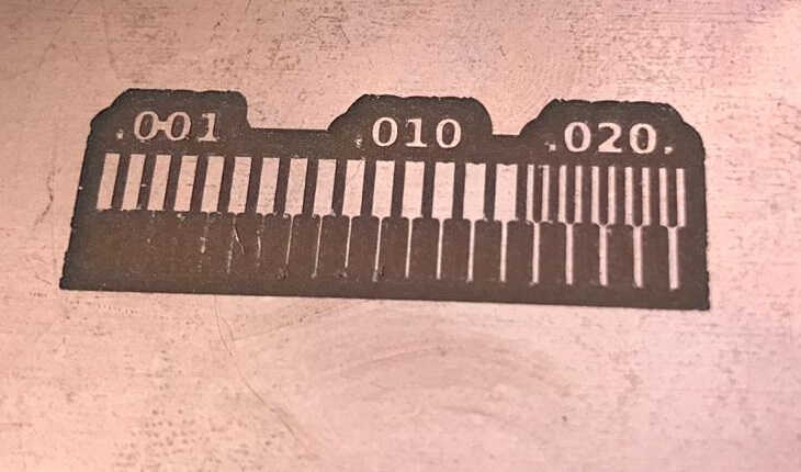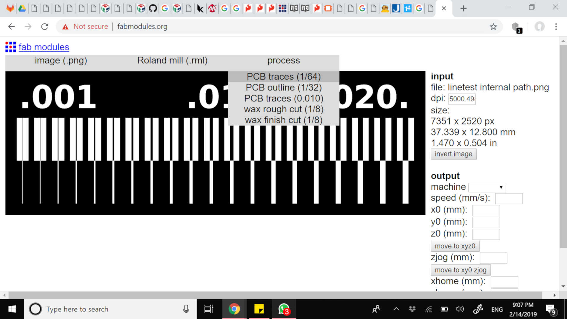 In order to characterize the design rules for our PCB production process, we have to do the line test (see below image). This test enables us to check the range of the line thickness that our milling machine can drill with a specific drilling bit tool