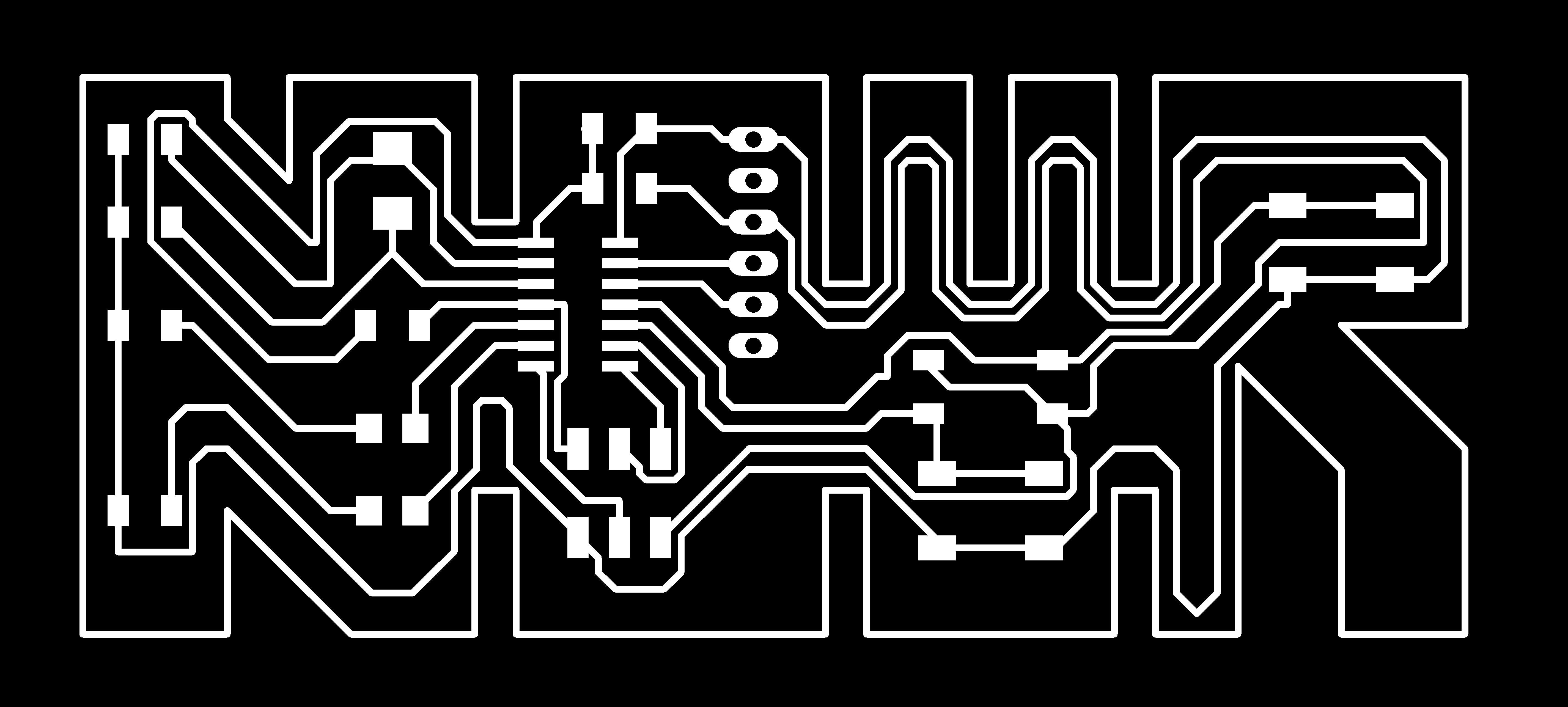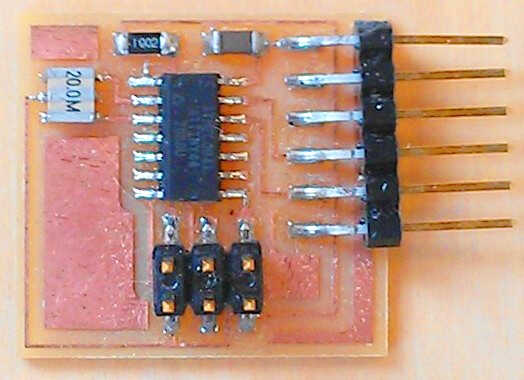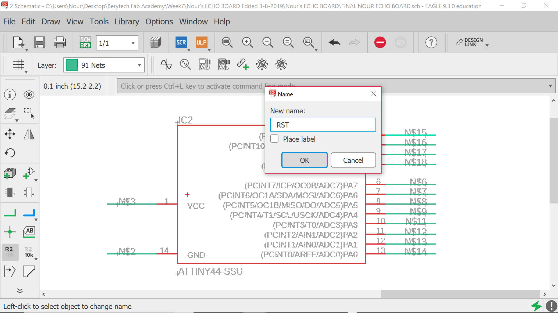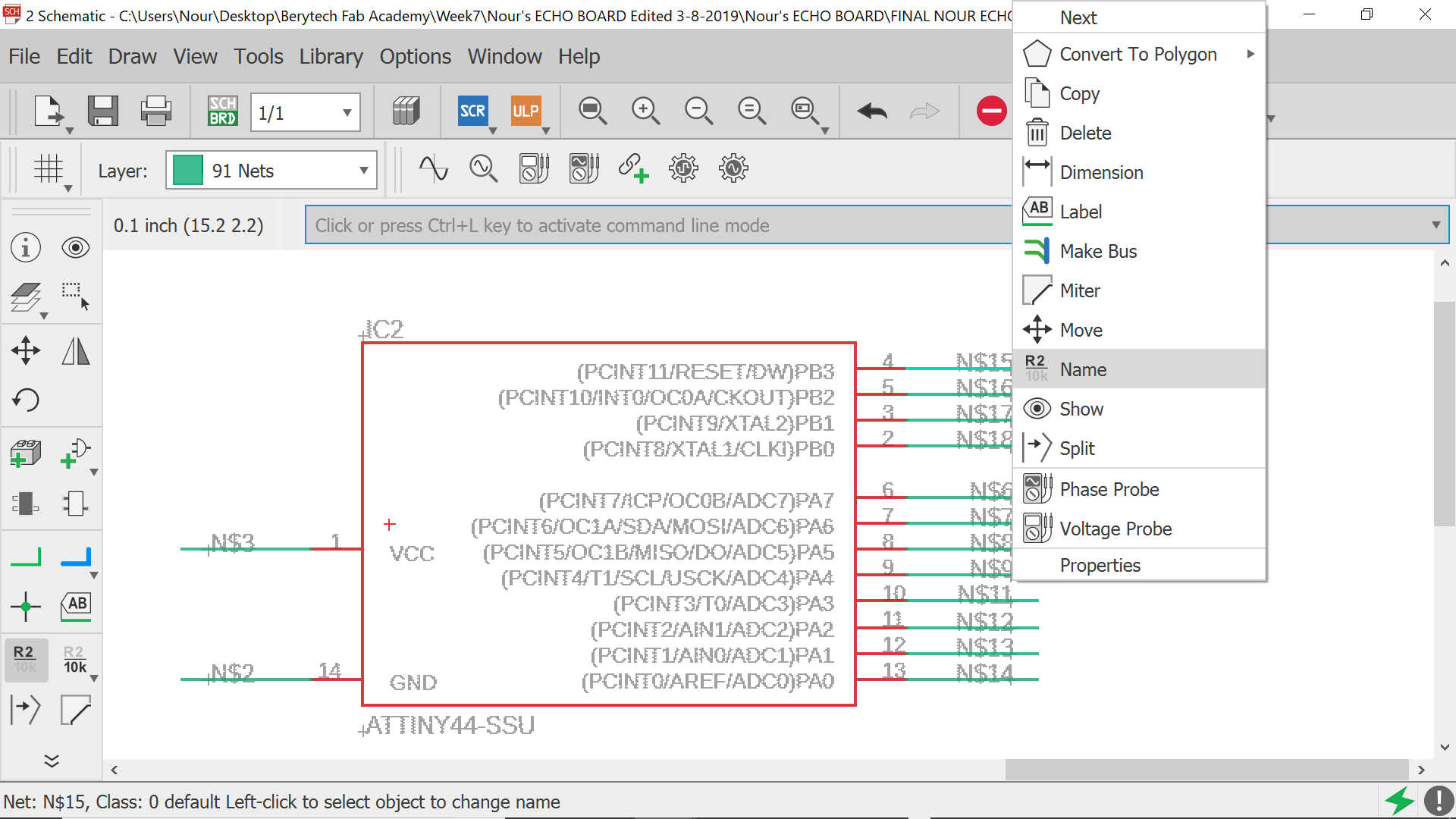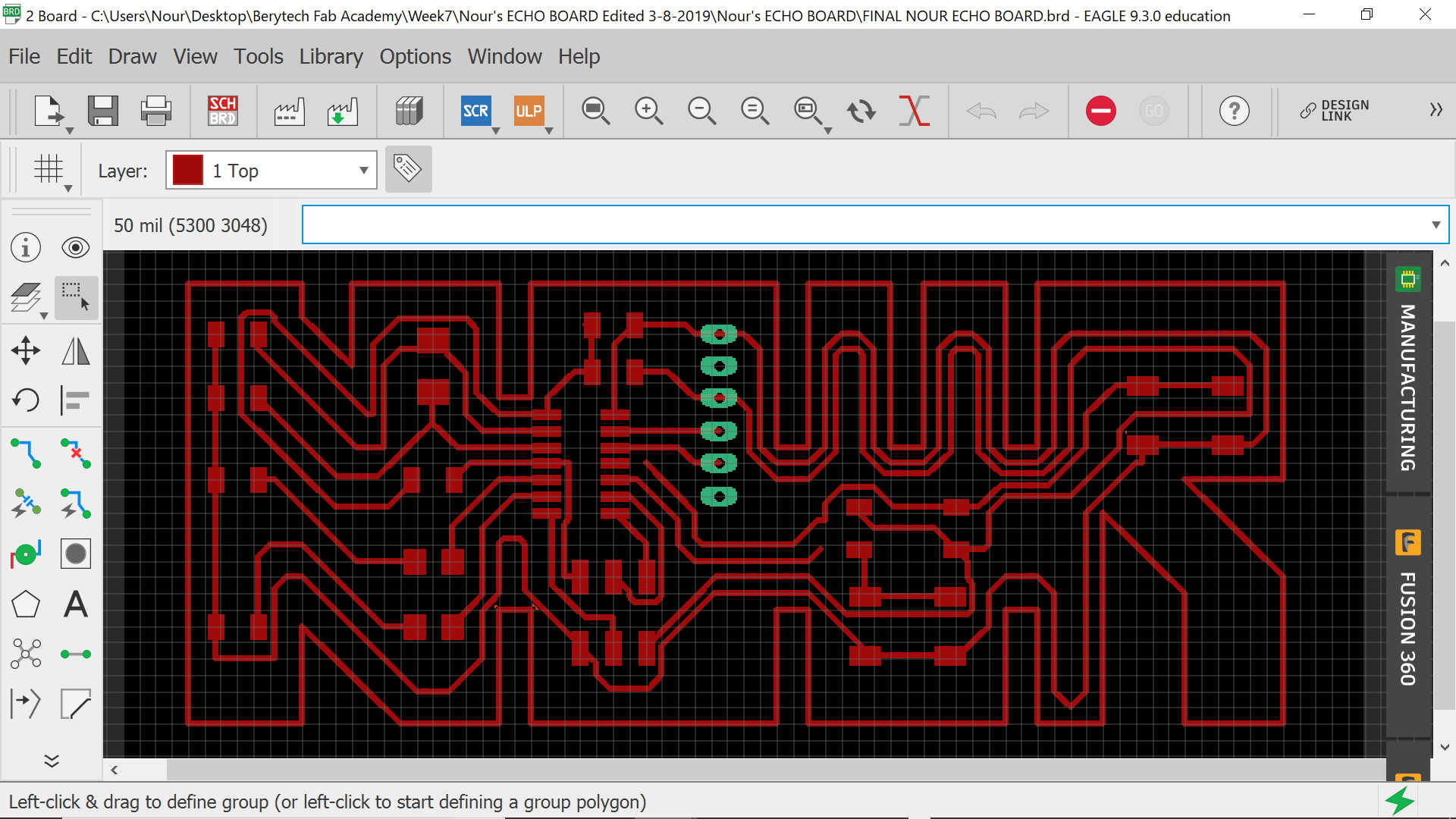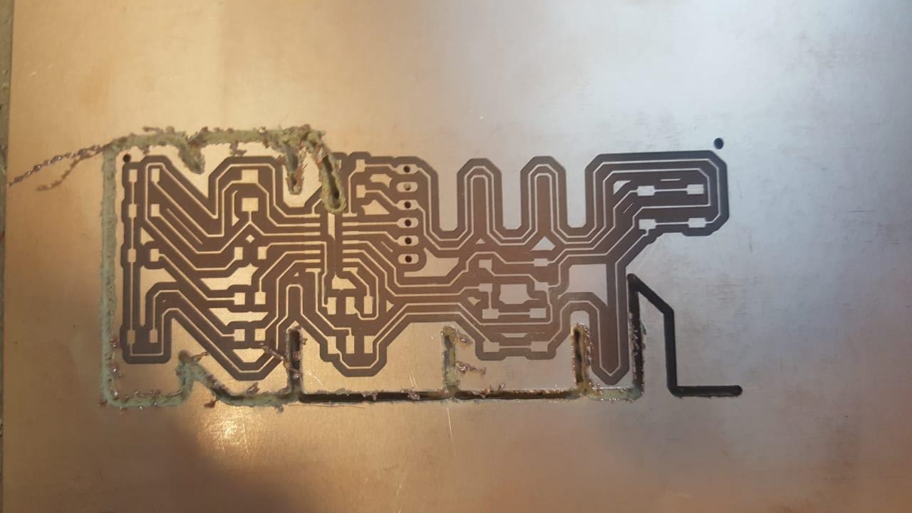 And as you can see in the photo above, the external path had ruined the whole board because the spacing between the letters of my name was too small for the milling bit that is used (1.2mm). So there was of course a third trial, where I have applied modifications to the external path and drew it as a rectangle that is independant from the letters of my name -which was the best scenario at that time in order to save time. I could have edited the whole board to make the spacing bigger but I ran out of time...