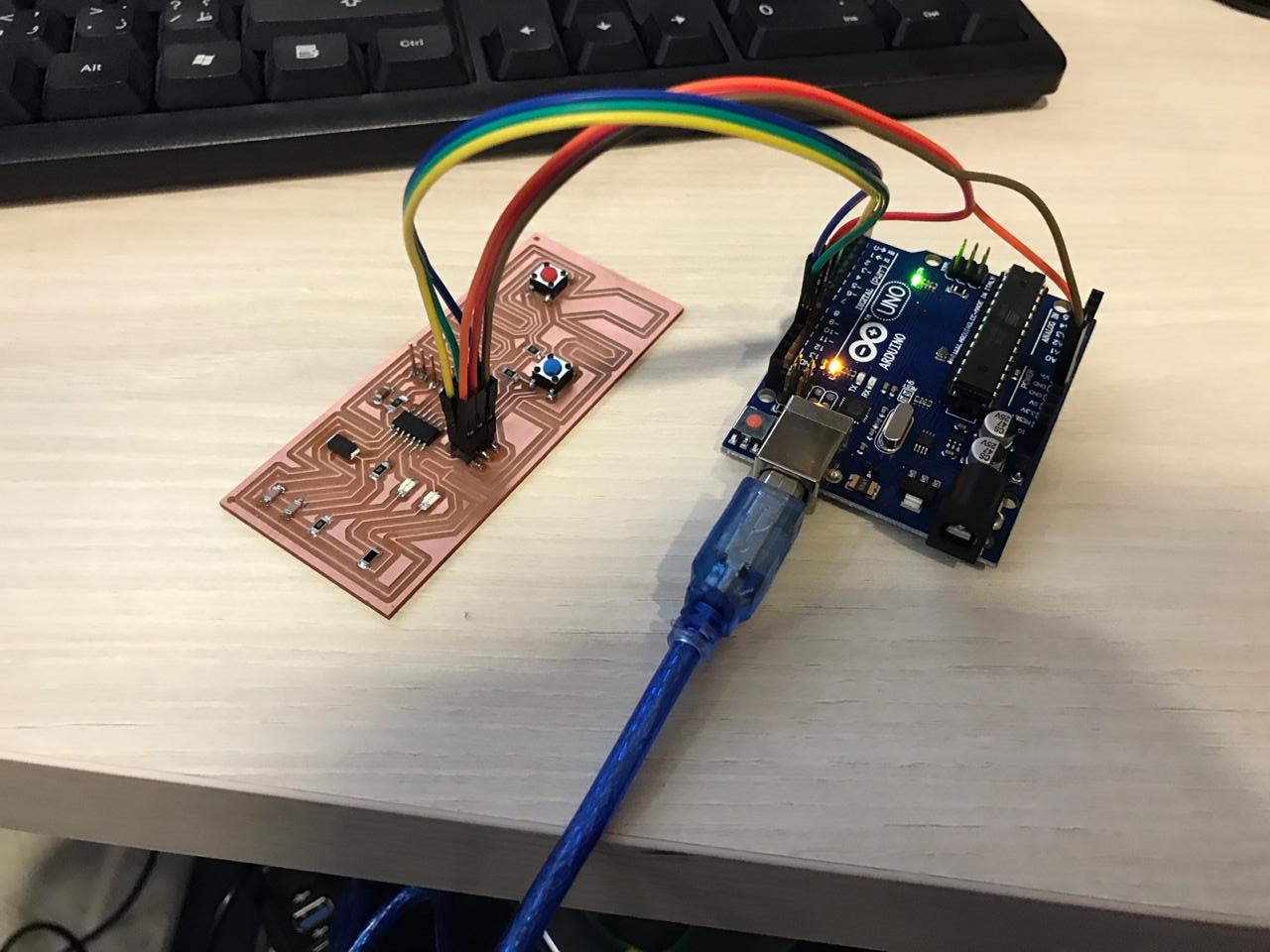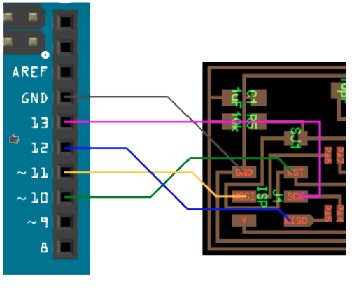Then disconnect, and connect the hello board to the Arduino board via the ISP on the board following the below schemata and reconnect it to the laptop