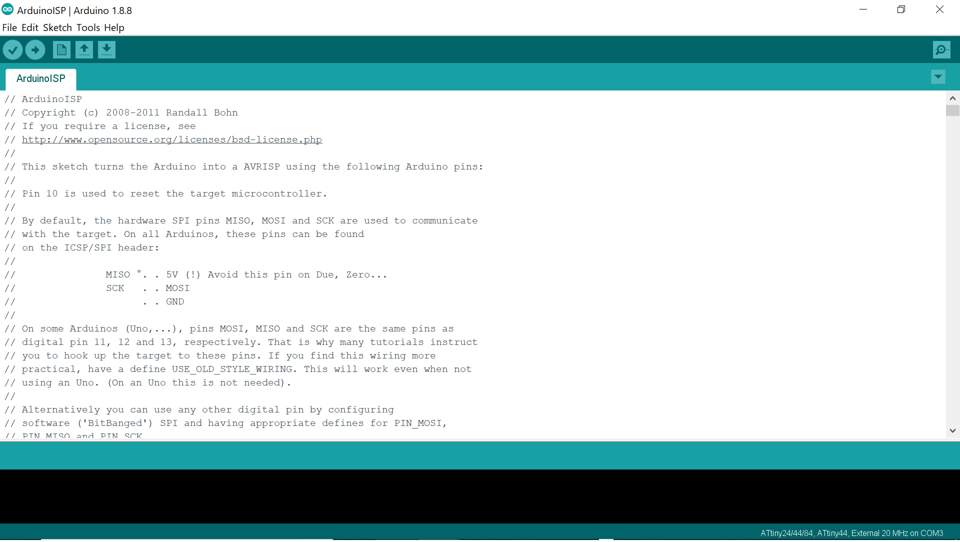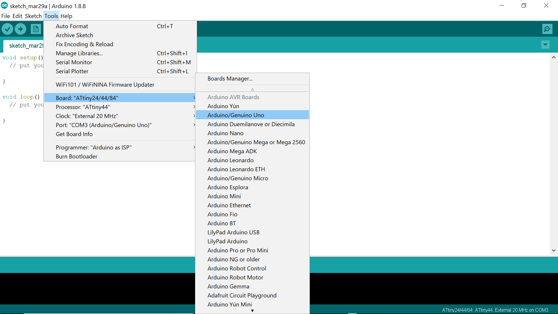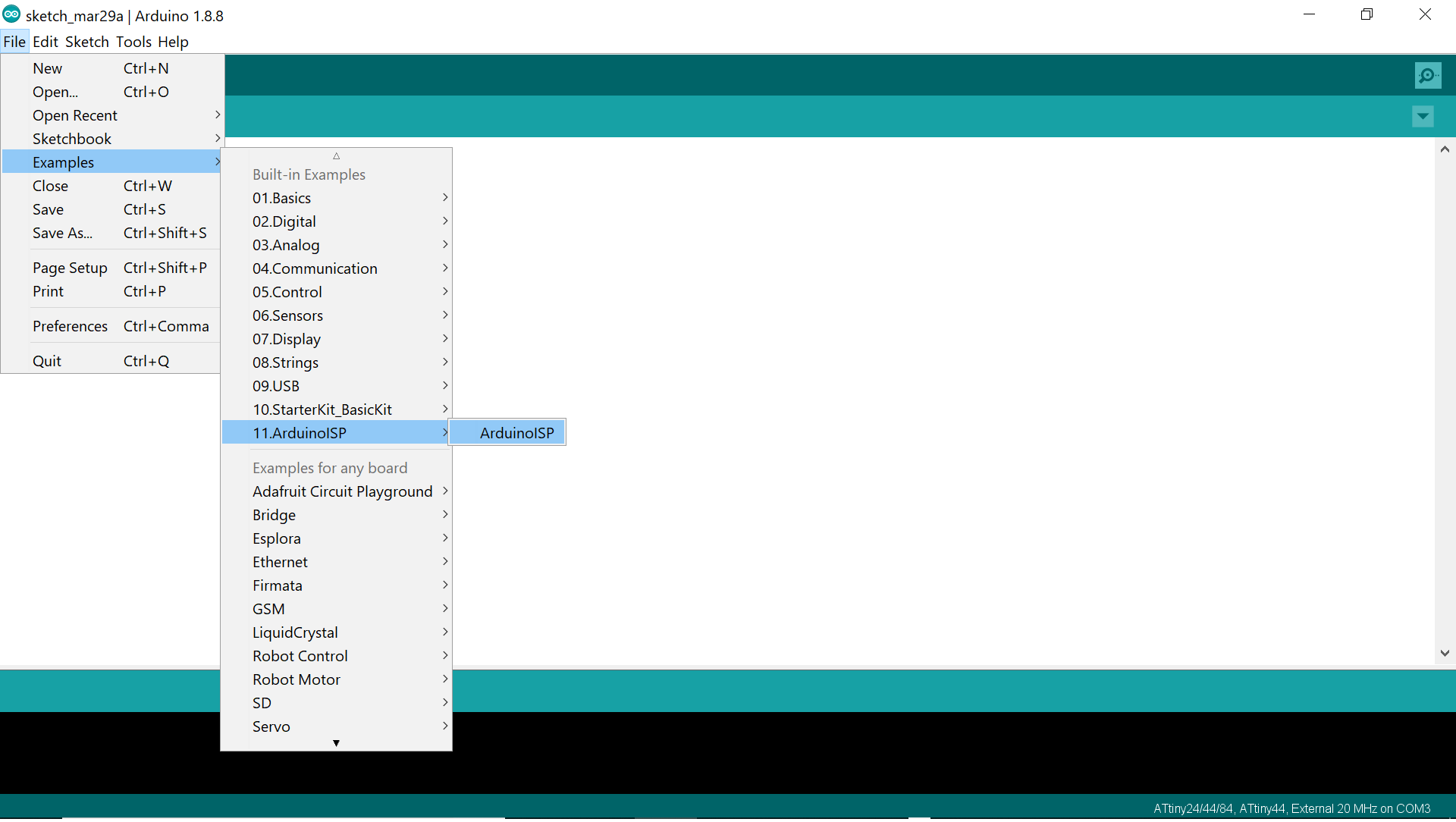 The programming will take place using ARDUINO UNO; So the first thing that needs to happen is to let the Arduino work as ISP so that we can use it to program the board for the very first time
