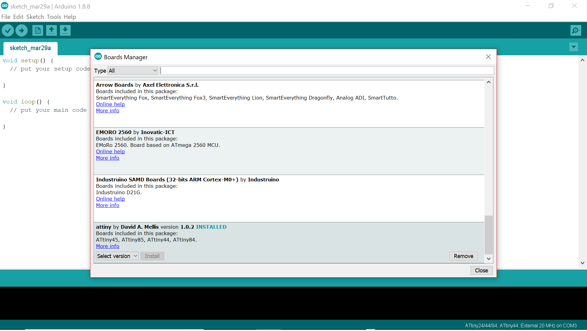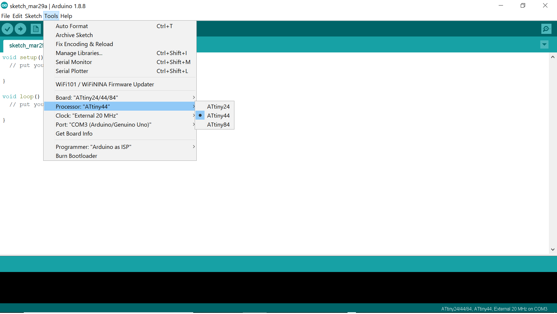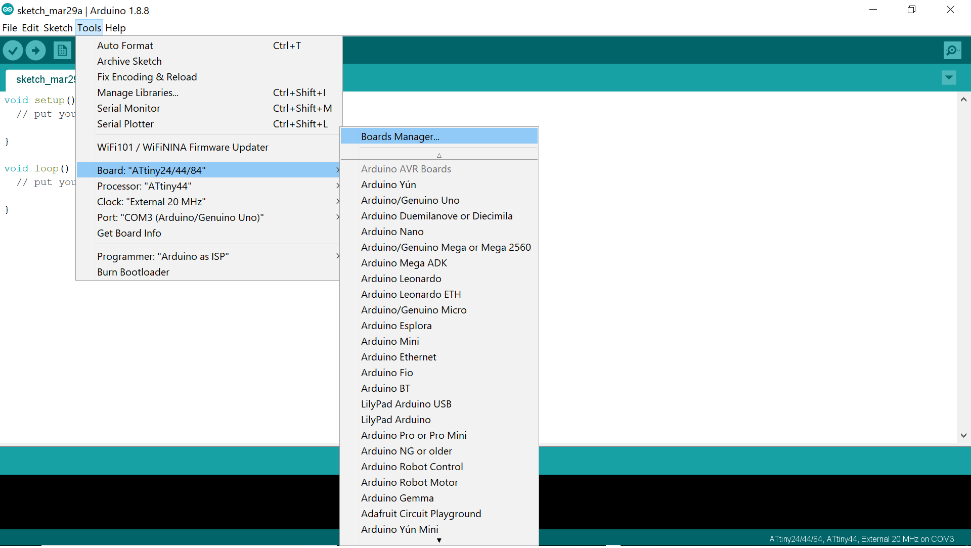 Then go to TOOLS> Boards Manager and install the attiny44 then choose processor as Attiny44 and select clock