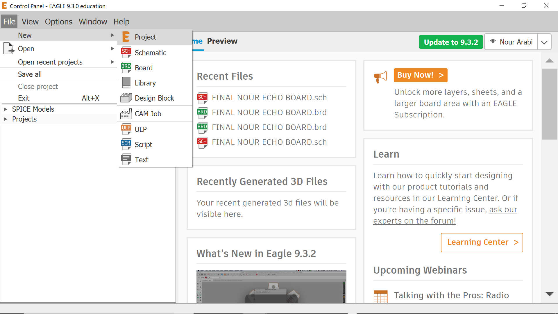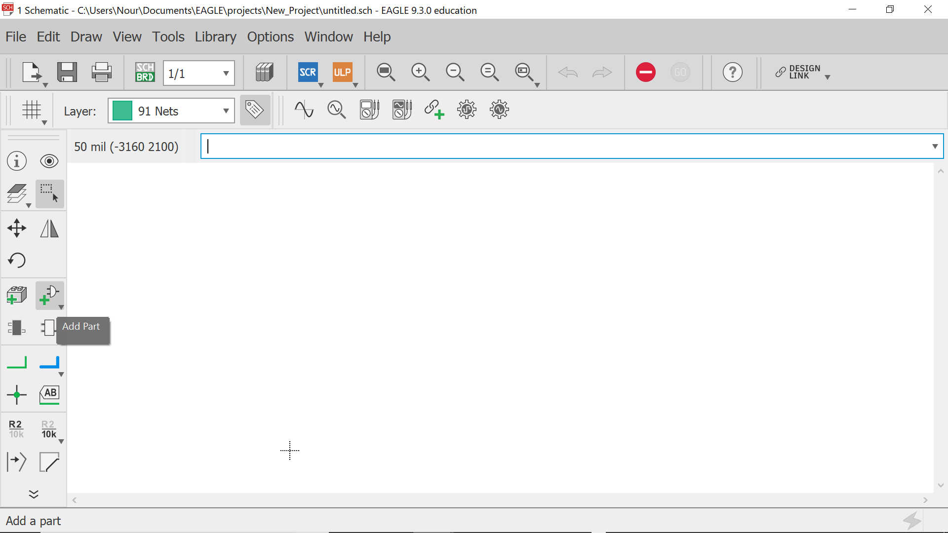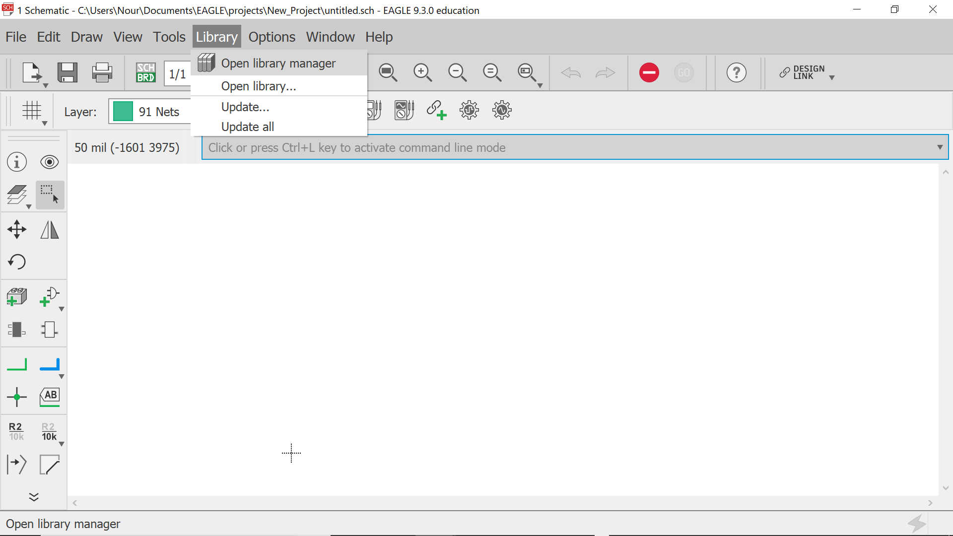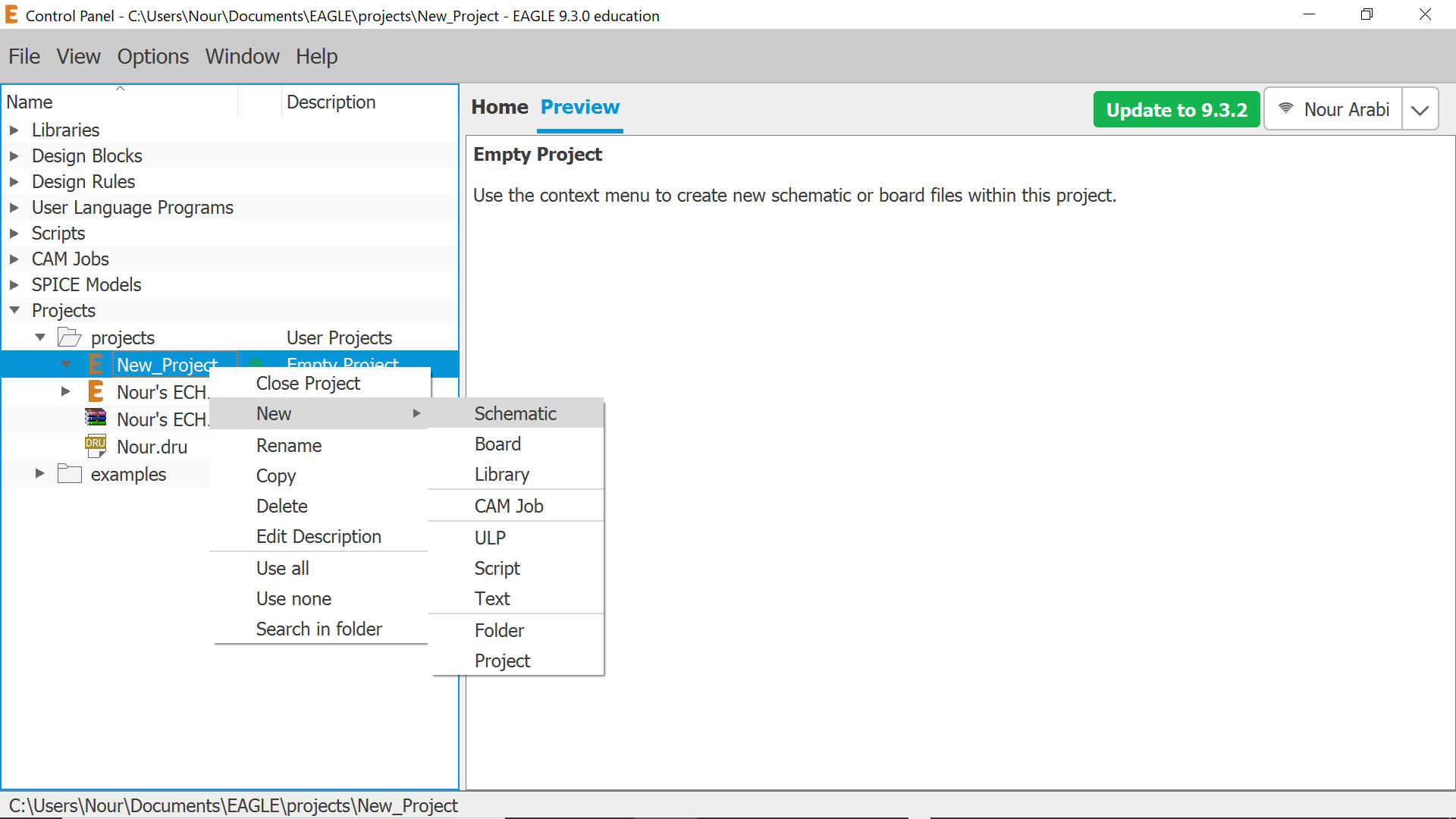 The first thing you need to do when opening Eagle is to open a new project and a new schematic as per the below photos. So the schematic is the main sketch of your components and how they are going to be logically connected before actually drawing the final routes or wires of the board; All your files will be saved in one folder, which is the folder of your project