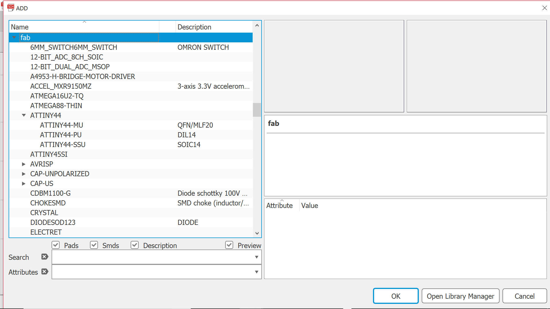 Then you may start placing your components by clicking on the Add Part icon and look for them under the fab library section -as per the below example