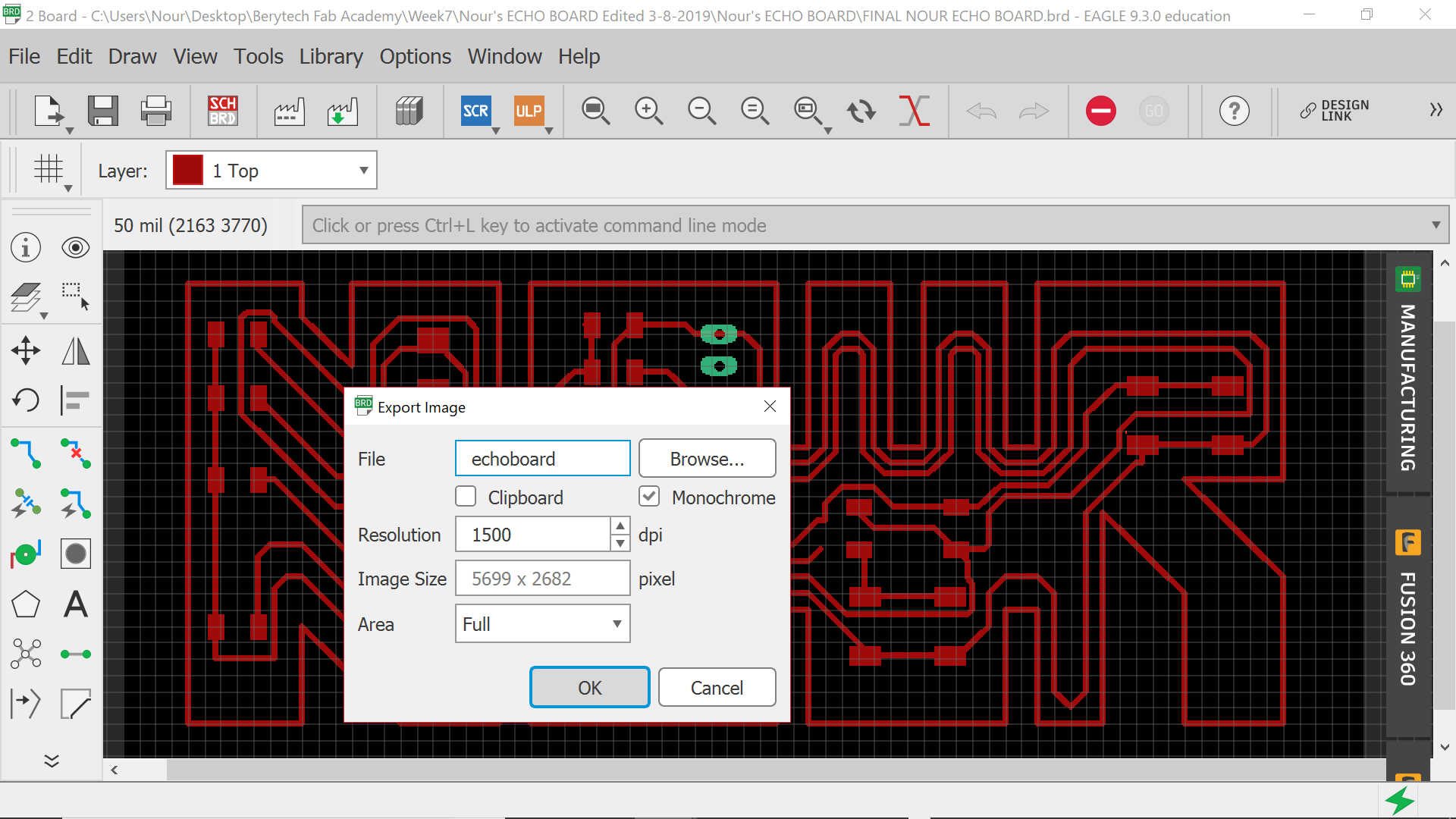 Then export the image and make it monochrome (so you can have it in black & white) for generating the G code needed for milling. You also need to put the resolution as 1500 dpi