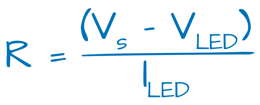 And according to the red LED datasheet, and as per the below equation, we can calculate the resistance needed and which is 86.6Ω. The closest number available at the lab is 100Ω.