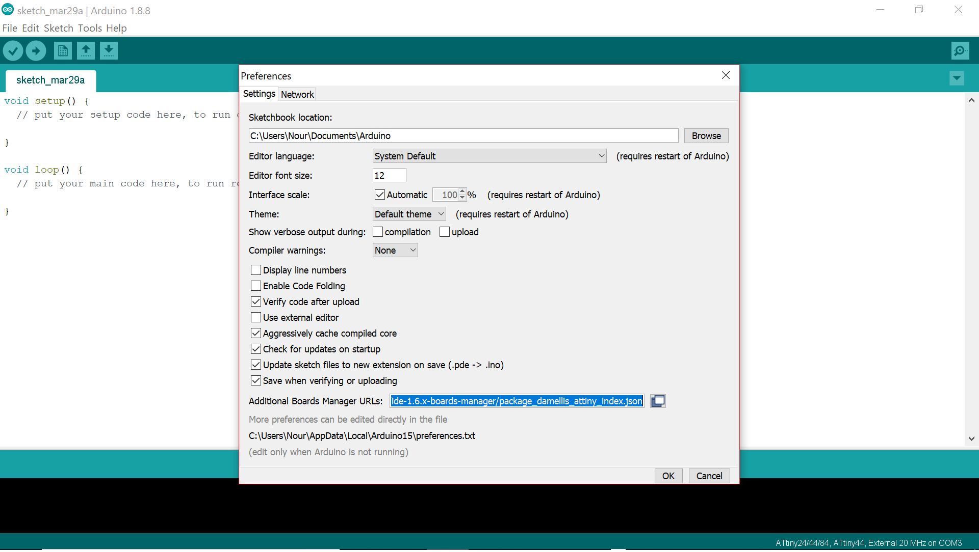 The microcontroller on the Hello Board is the ATTINY 44 so we need to make it clear for the ARDUINO that it is dealing with this MCU. And for doing so, we need to install the ATTINY 44 by going to FILE>PREFERENCES and inserting the following link: "https://raw.githubusercontent.com/damellis/attiny/ide-1.6.x-boards-manager/package_damellis_attiny_index.json" in the Additional Boards Manager URLs