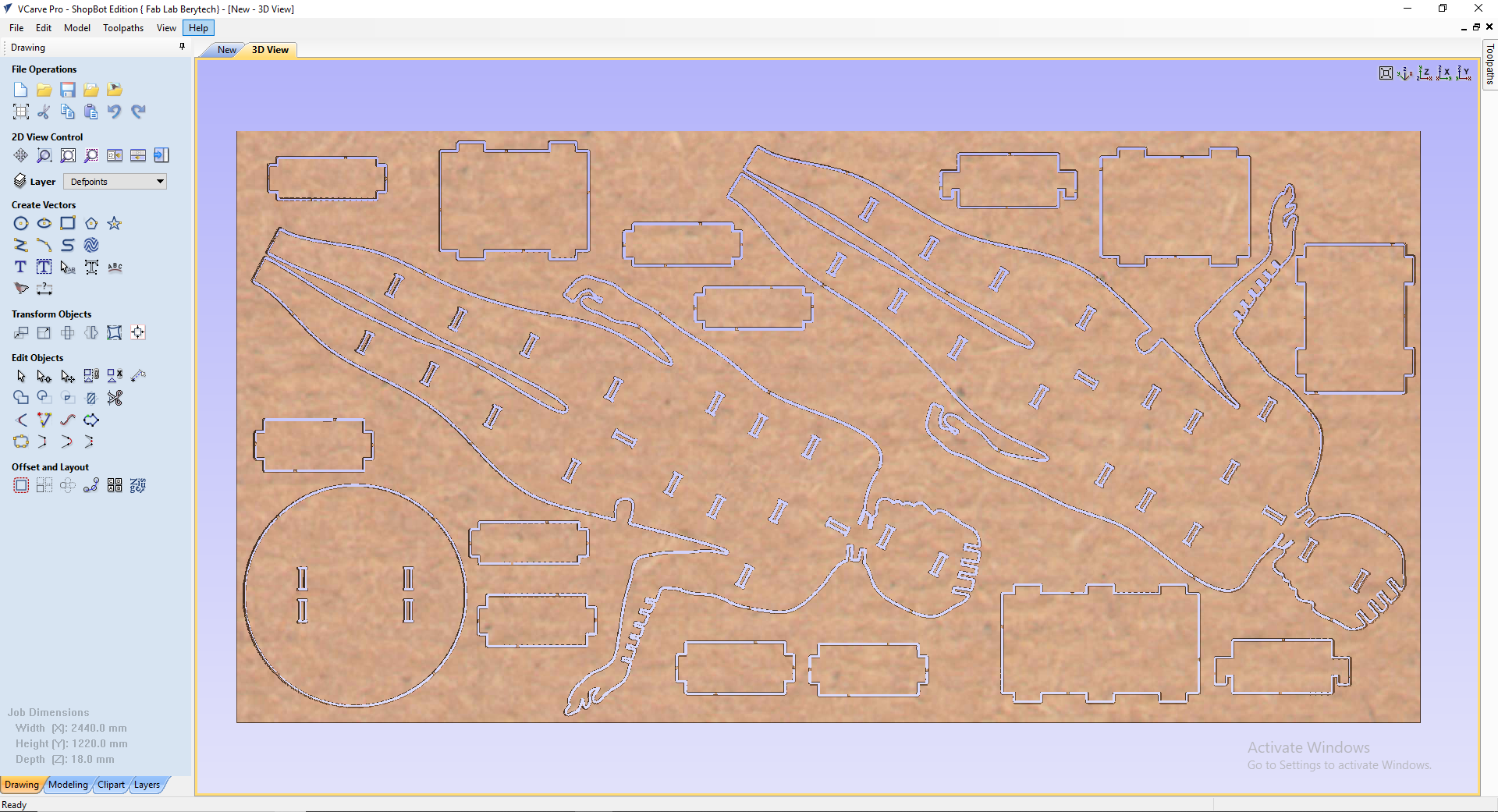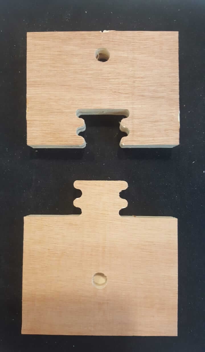 We now move to the CNC room and place the plywood board and open the file in VCarve software to generate the G codes; one for the internal slots and one for the external outline by adding tabs: