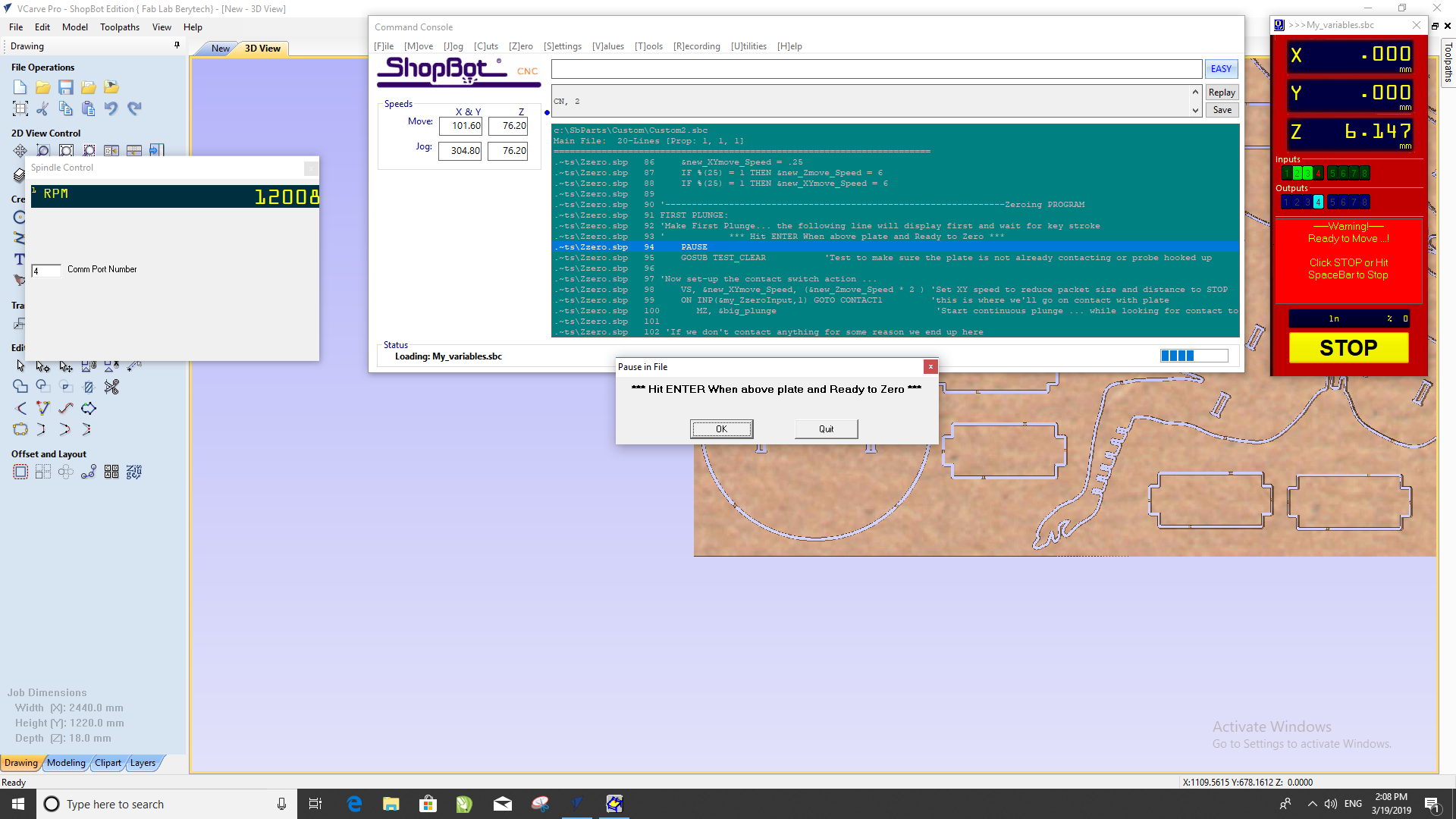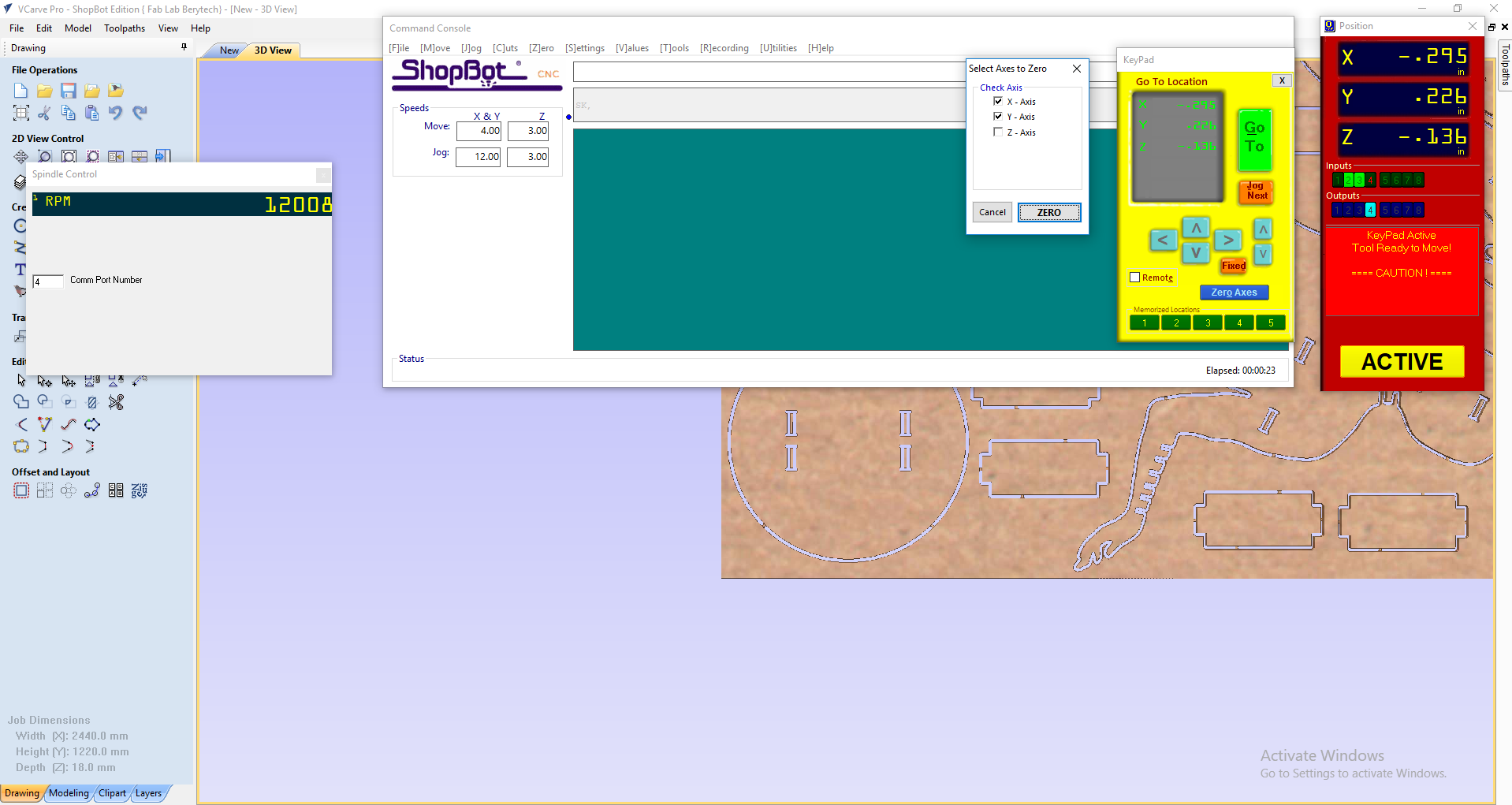 In order to complete this assignment for our Shopbot 96-60-8 (working bed of 2.44m x 1.52m x 0.15m), we have done several tests. But before the tests, we had to know several things: