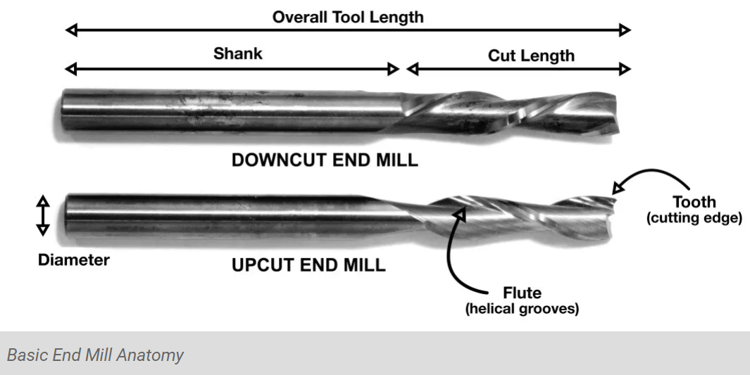 The project type, material being cut, and desired surface finish determines the tool geometry. Key tooling features include the diameter, shank, flutes, teeth, tip shape, center cutting capability, helix angle, helix direction, length of cut, and overall tool length