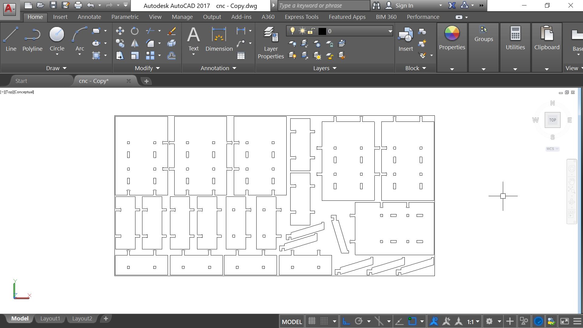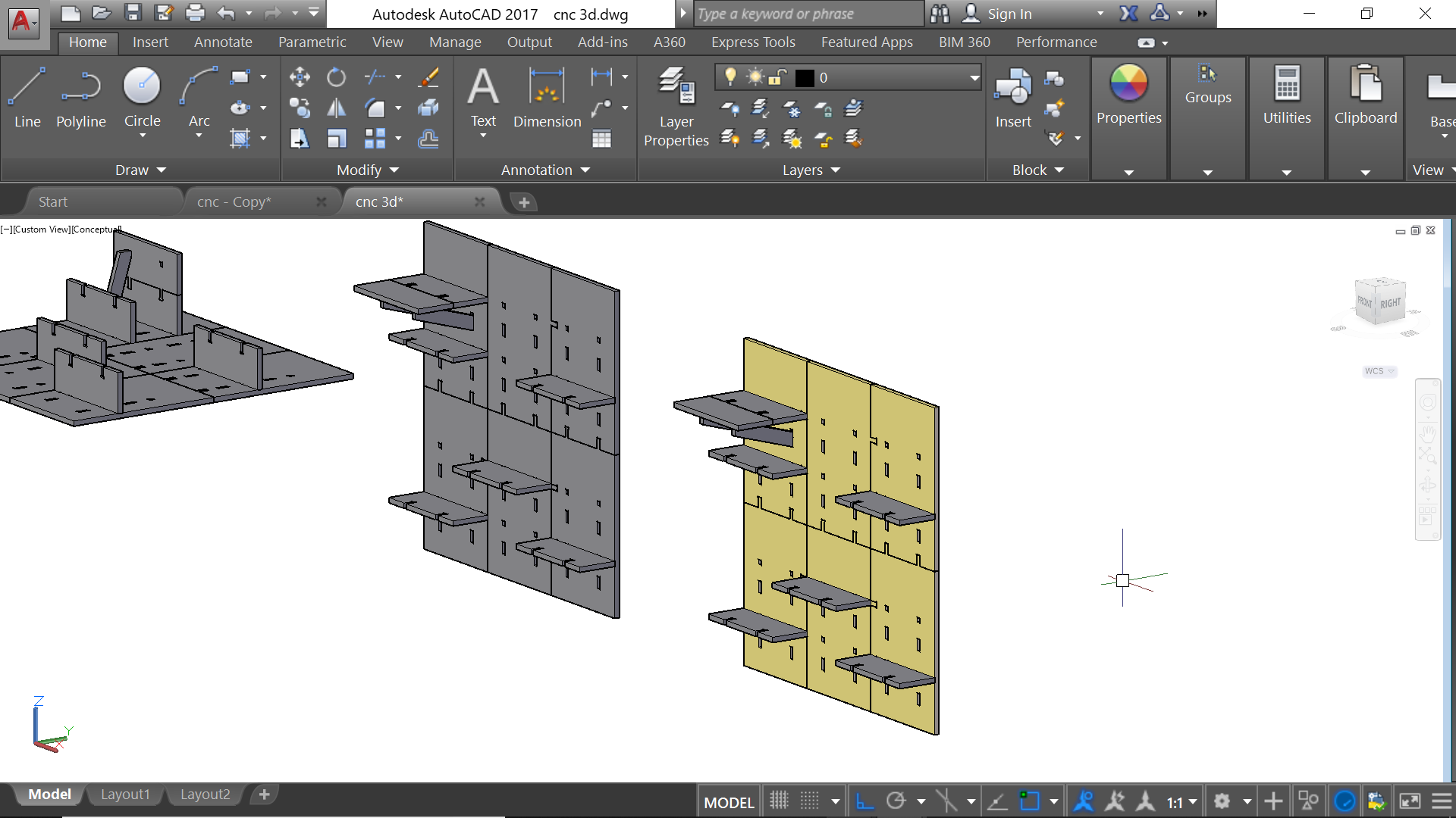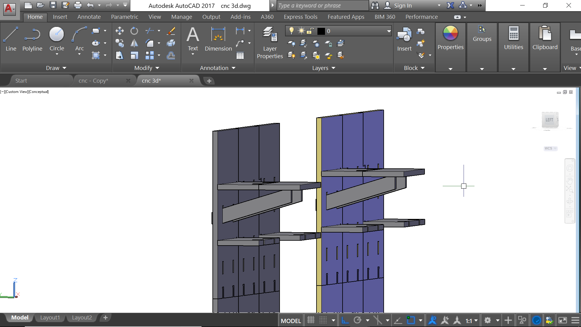 For this assignment, I used AutoCad for drawing my design. I wanted first to make some shleves that I can use in my workshop at home; But then I changed my mind. However, I am documenting the first idea of the shelves and want to highlight the fact the the cantilever that is supporting the shelves happened to be weak. I could have modified the design so they can be stronger but I preferred to CNC my silhouette in order to have it as a prephase for my final project. Let's take a look at the first shelves' design...
