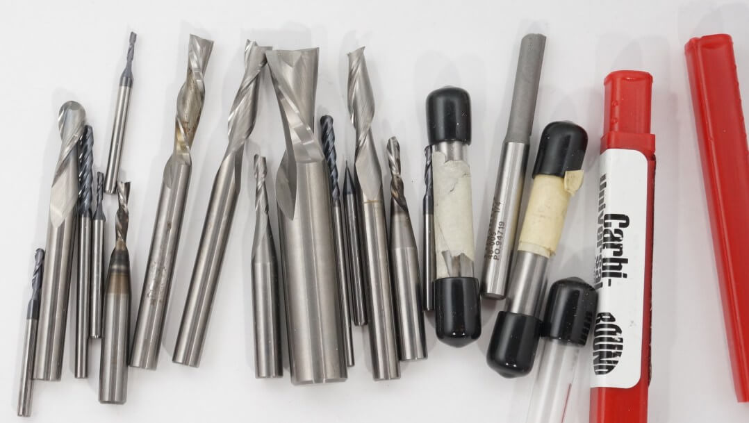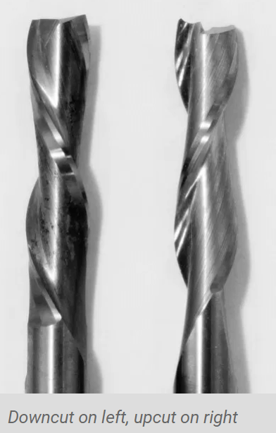 upcut mills eject chips towards the top of the workpiece, producing a cleanly cut bottom surface. The downside is possible surface splintering or “tearout” on the top surface as the chips are ejected upwards. Downcut tools do the opposite, producing a smooth upper surface. They are ideal for pieces that have been previously engraved or v-carved and cannot be flipped to hide tearout