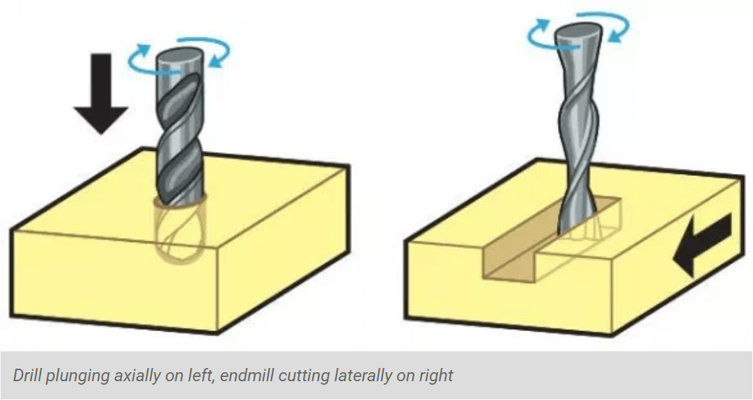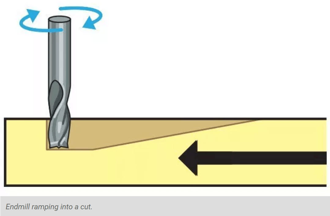 To minimize tool breakage and stress on the material being cut, most CNC software will “ramp” the end mill slowly into lateral cuts